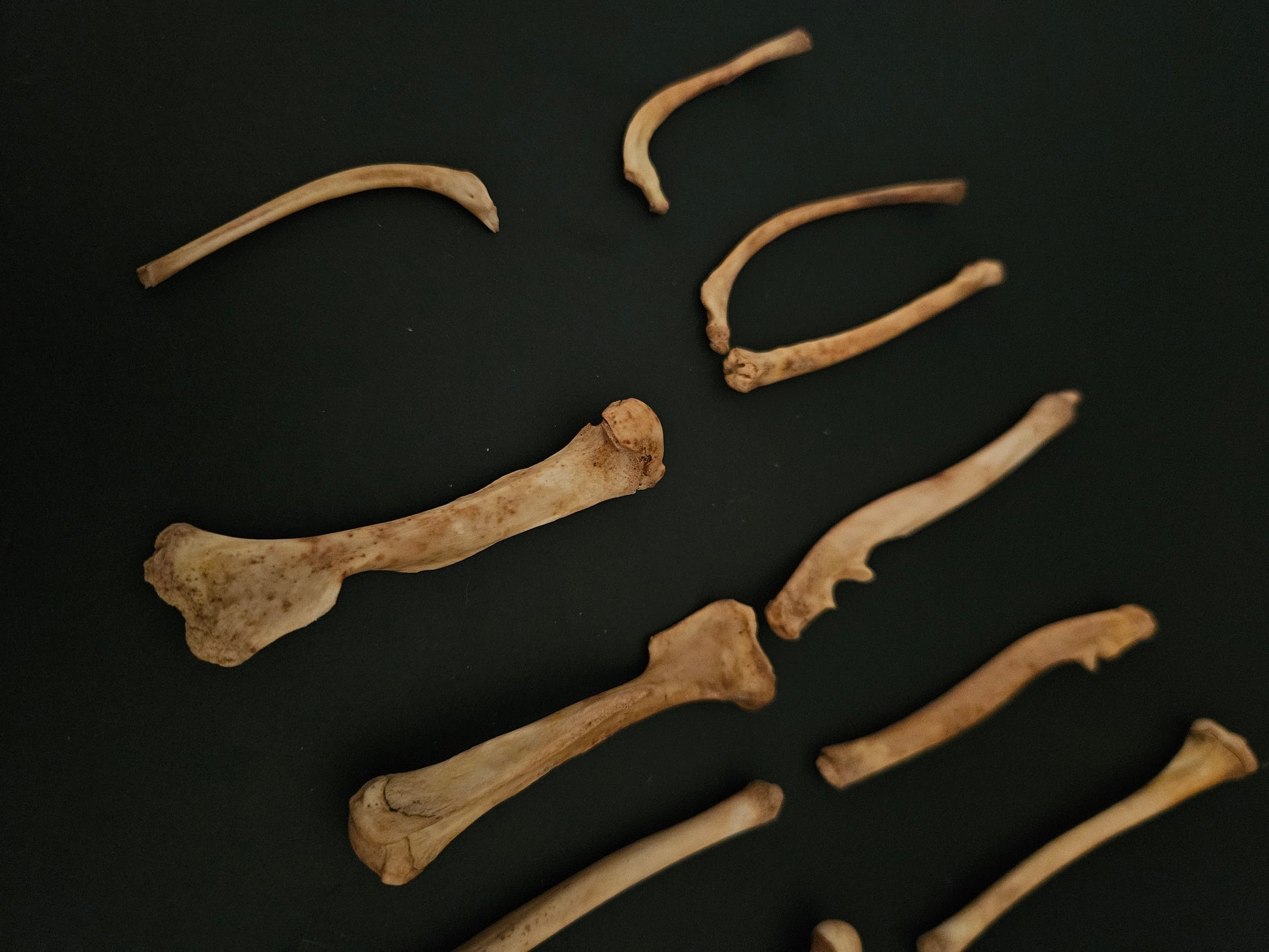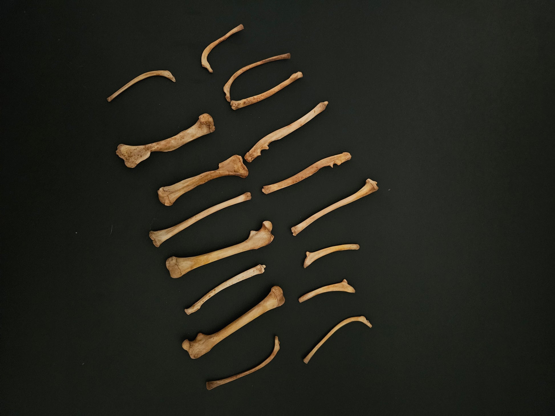Real assorted opossum bones. Cleaned, degreased, dyed with a combination of coffee/tea/rosemary solution. Will be difficult to whiten.