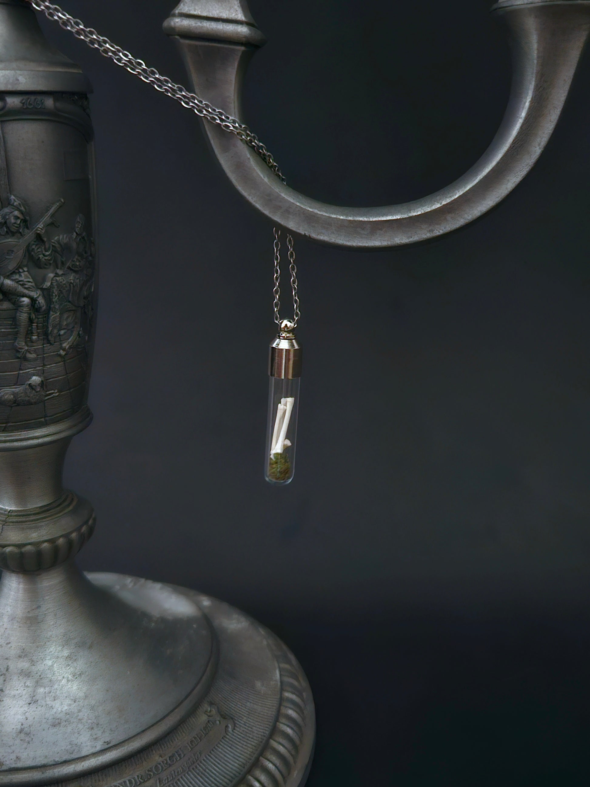 4 real assorted rat bones sit on preserved moss in a sealed vial pendant. 16 inch stainless steel chain with classic claw clasp and o ring connector.