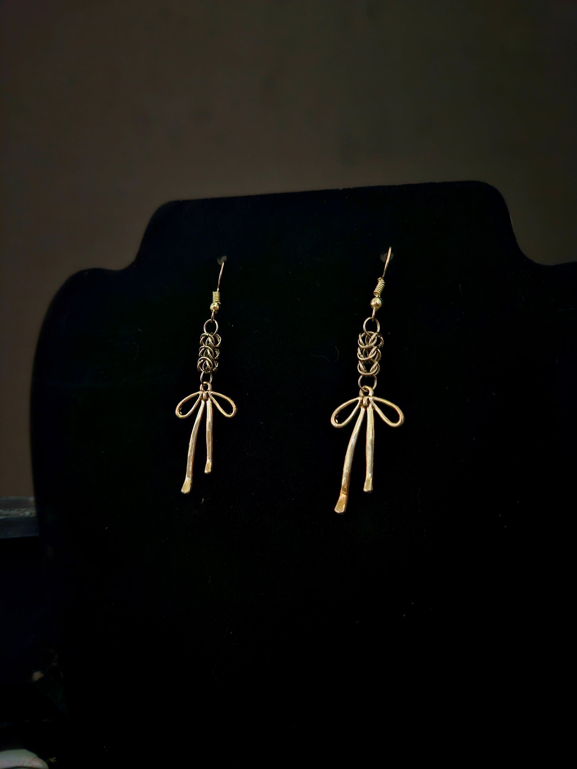 Stainless steel byzantine chain attaches a stainless steel bow charm to a stainless steel standard stud. Classic backing