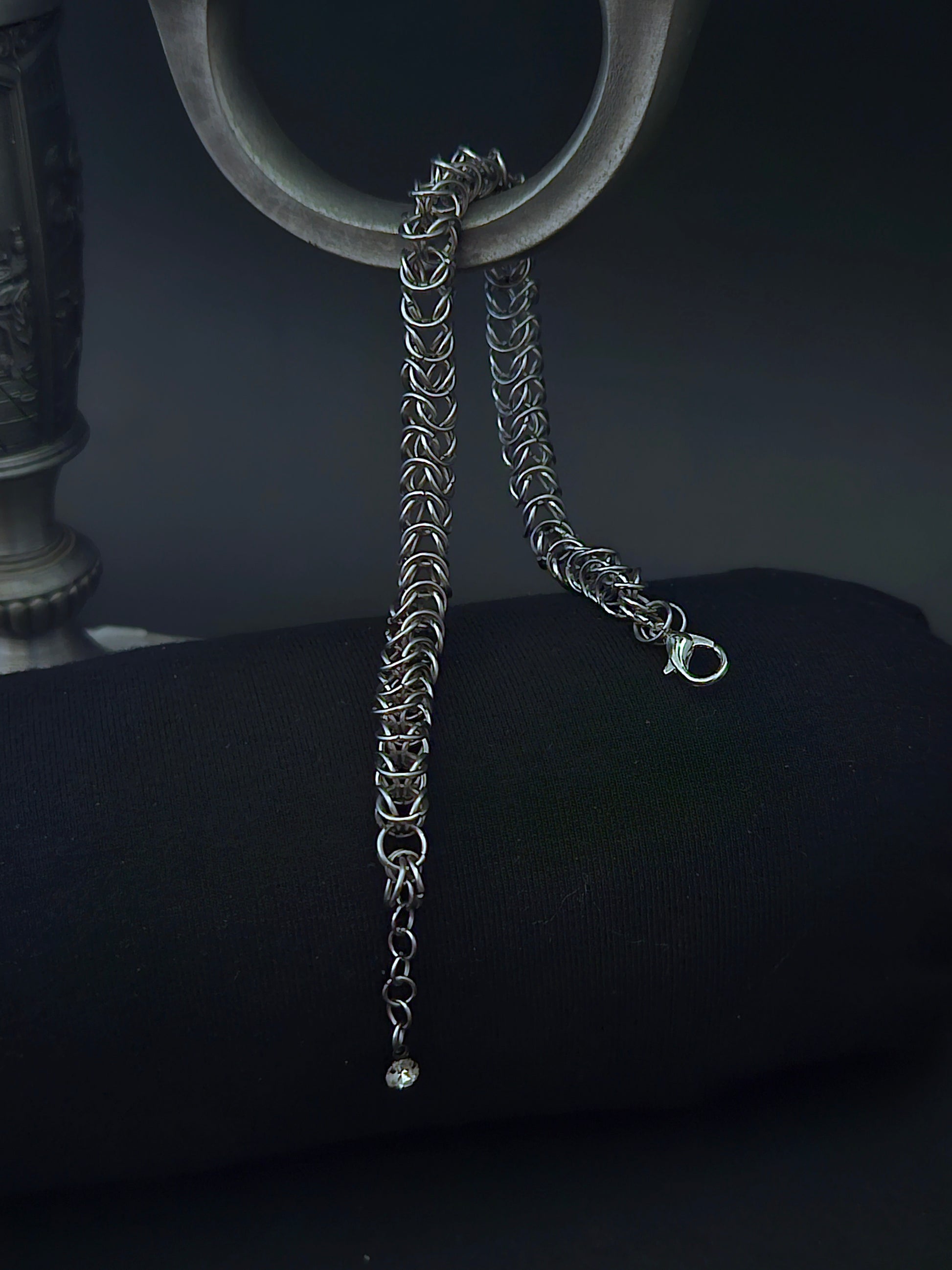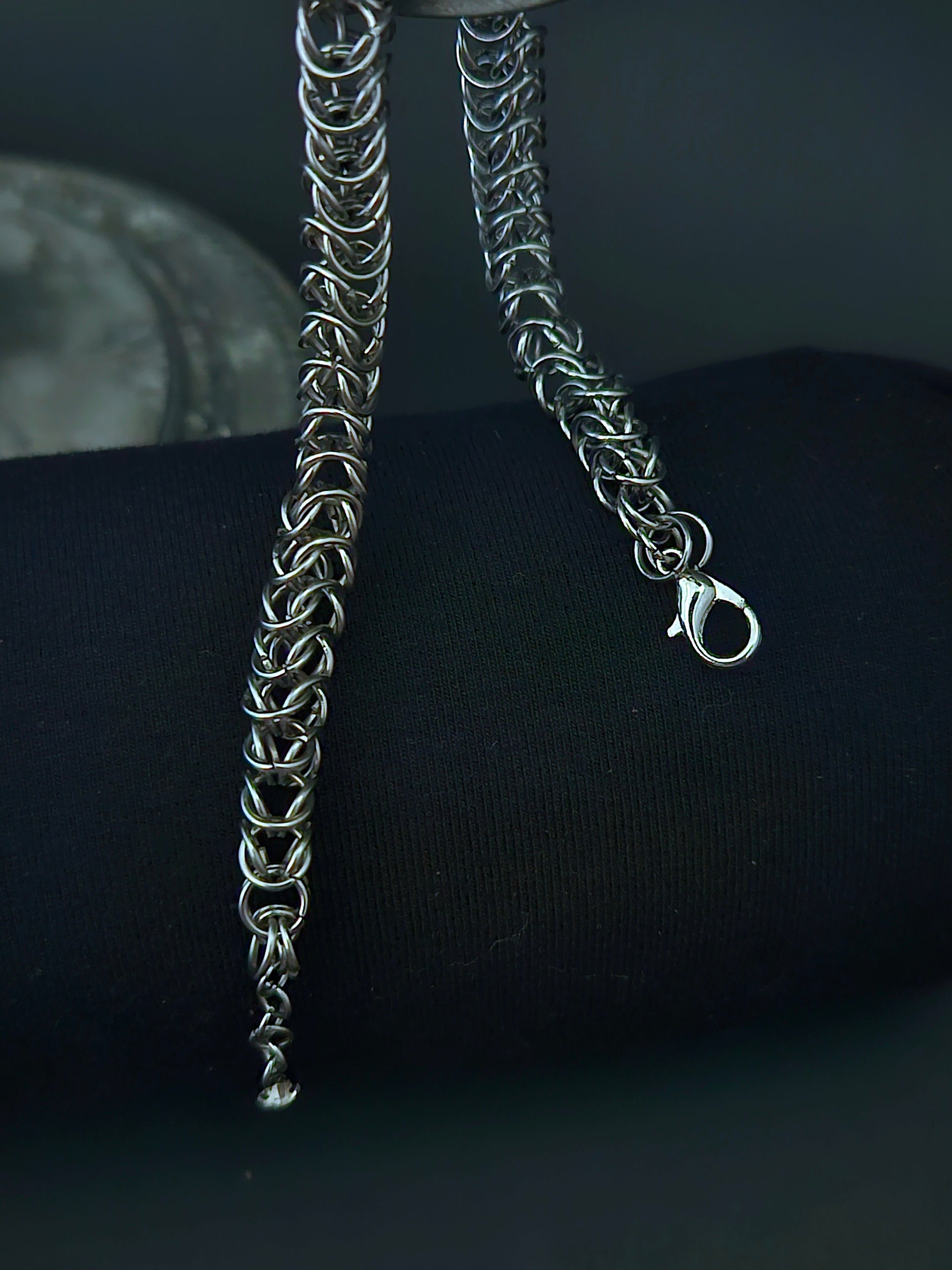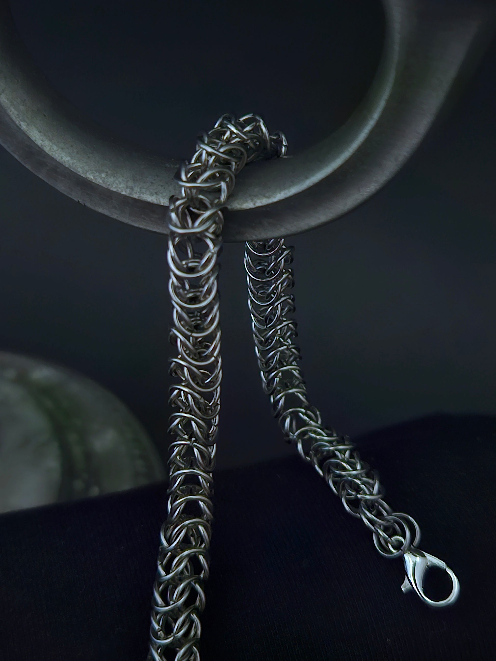Small sized byzantine weave creates a box like structure that coils around the wrist like a snake. Standard 7 inch bracelet with 1 inch extension. Claw clasp. Made by hand from stainless steel rings.