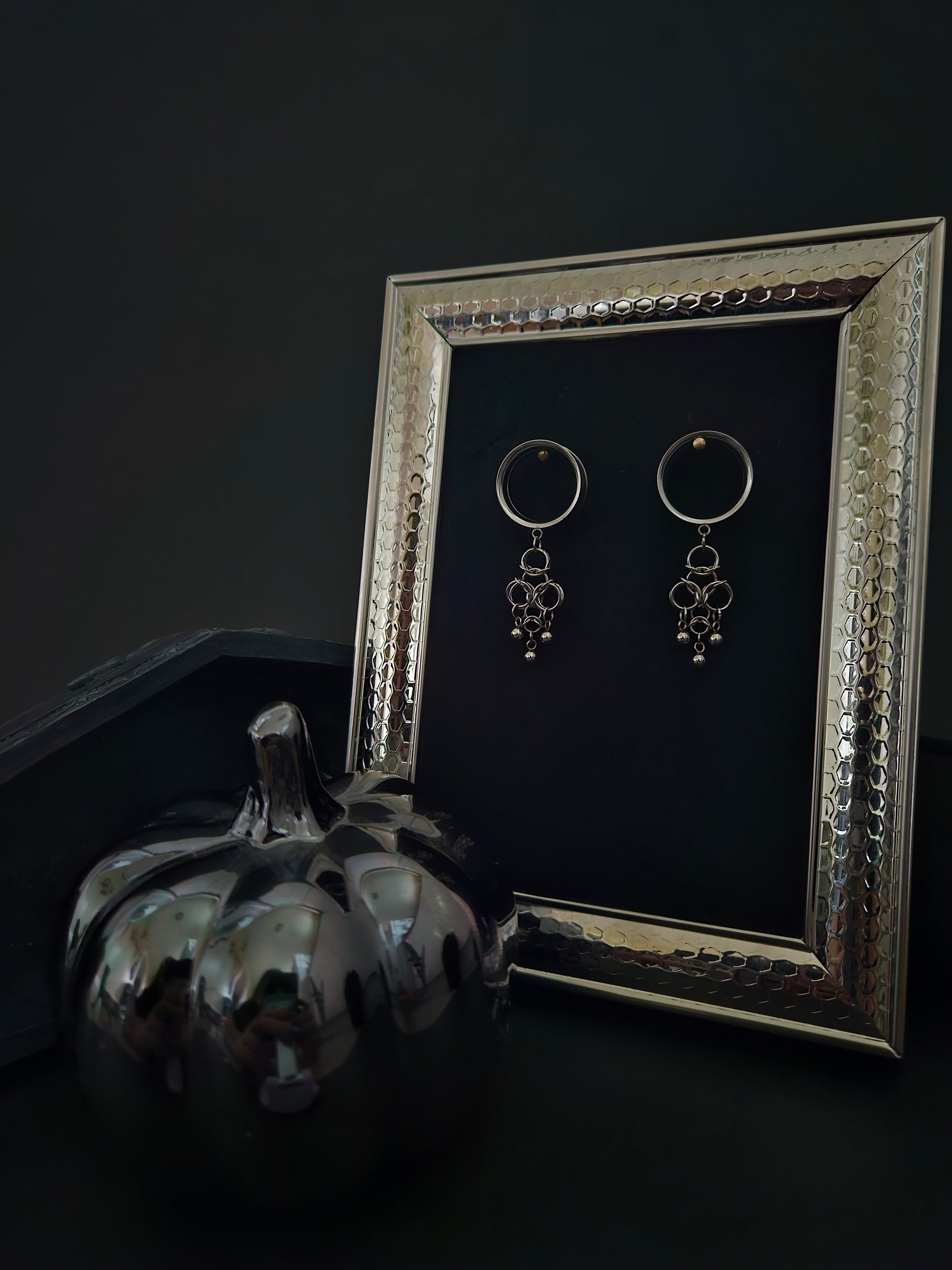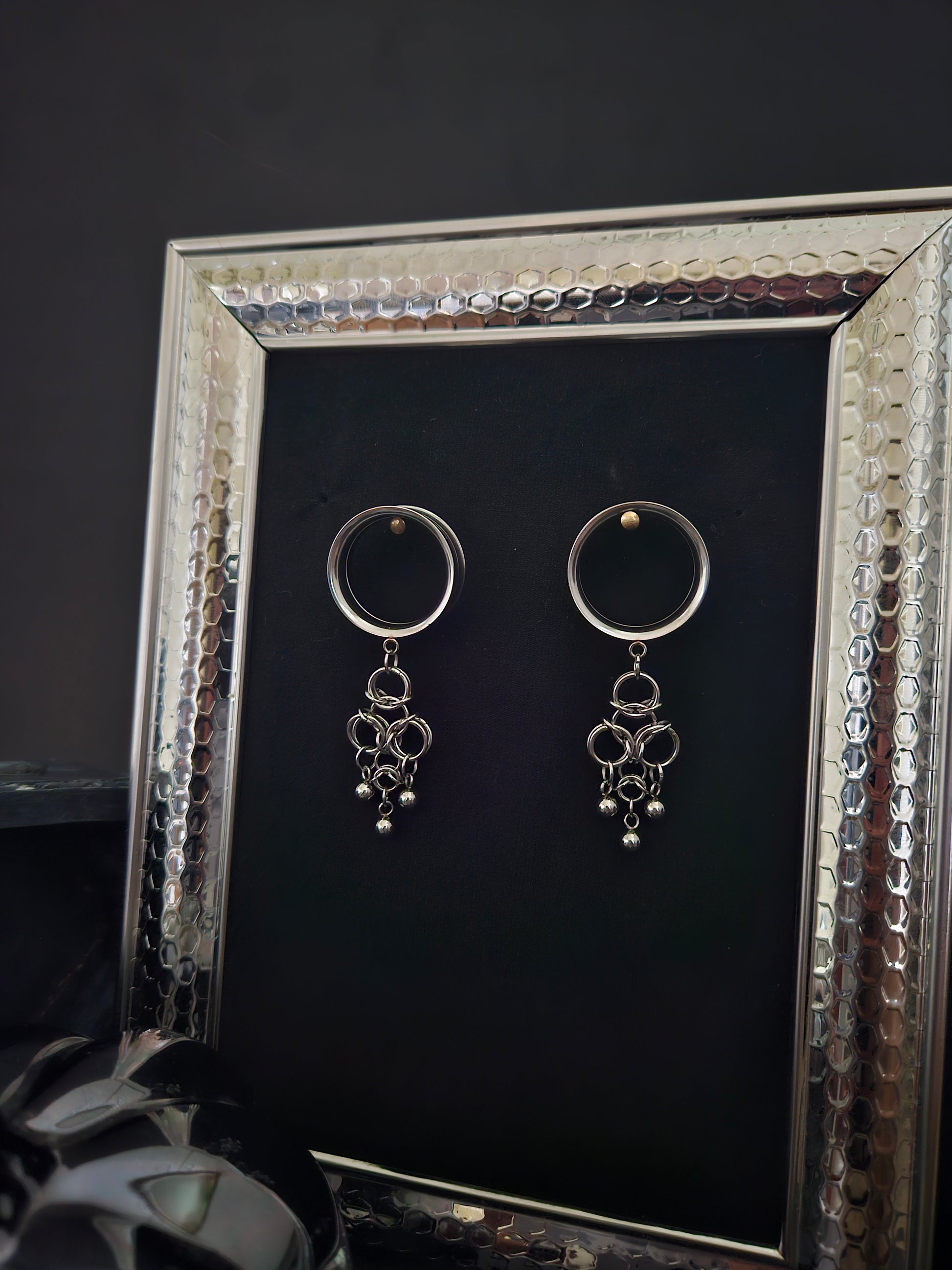 Stainless steel rings create abstract shape with stainless steel beads attached. Shown on 7/8 size tunnels. Stainless steel tunnels double flared with screw on back flare