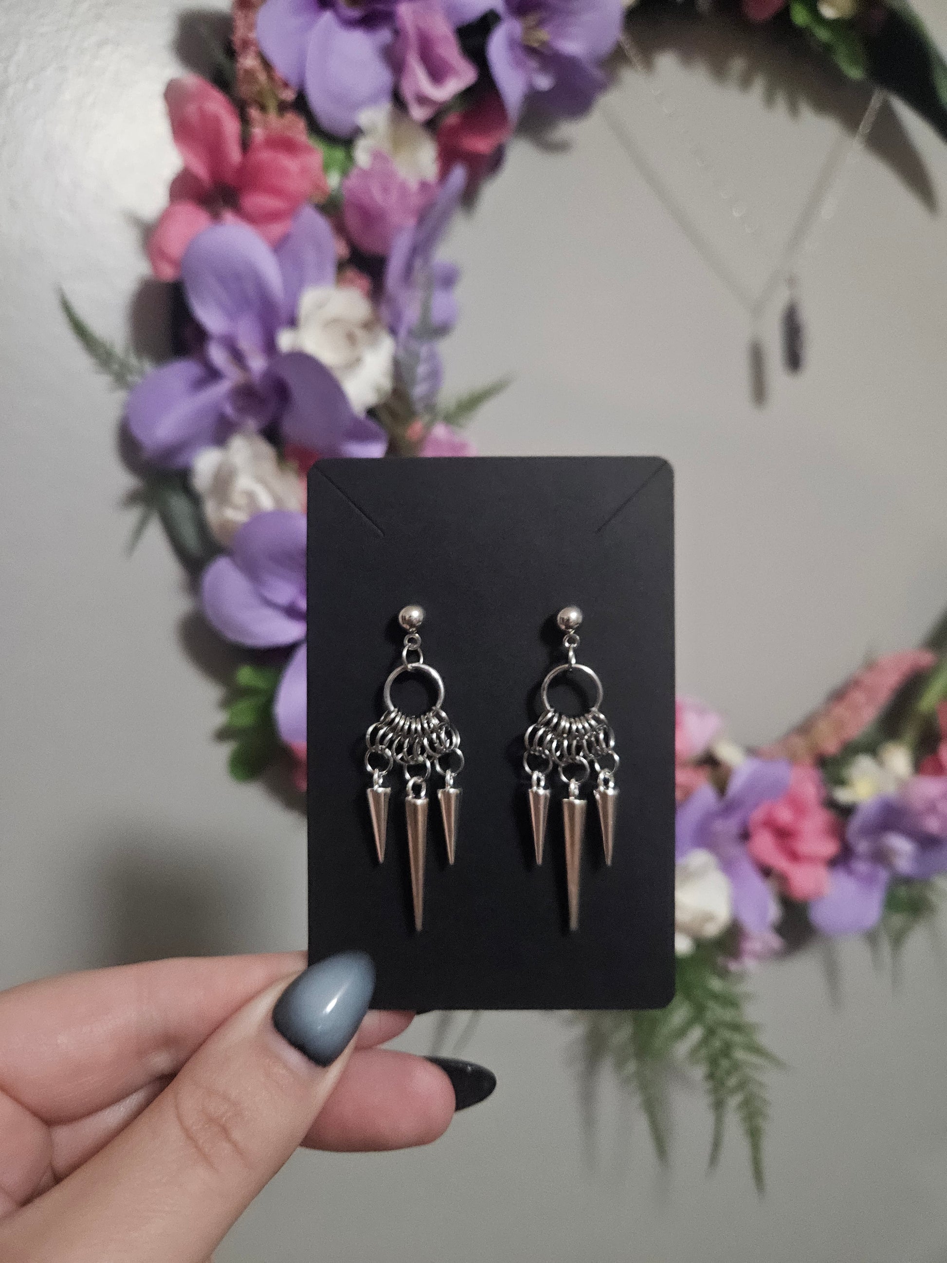 Stainless steel weave of 9 interlocking rings dangle from one center ring. Stainless steel spikes create the danger. Stainless steel stud with classic backing.