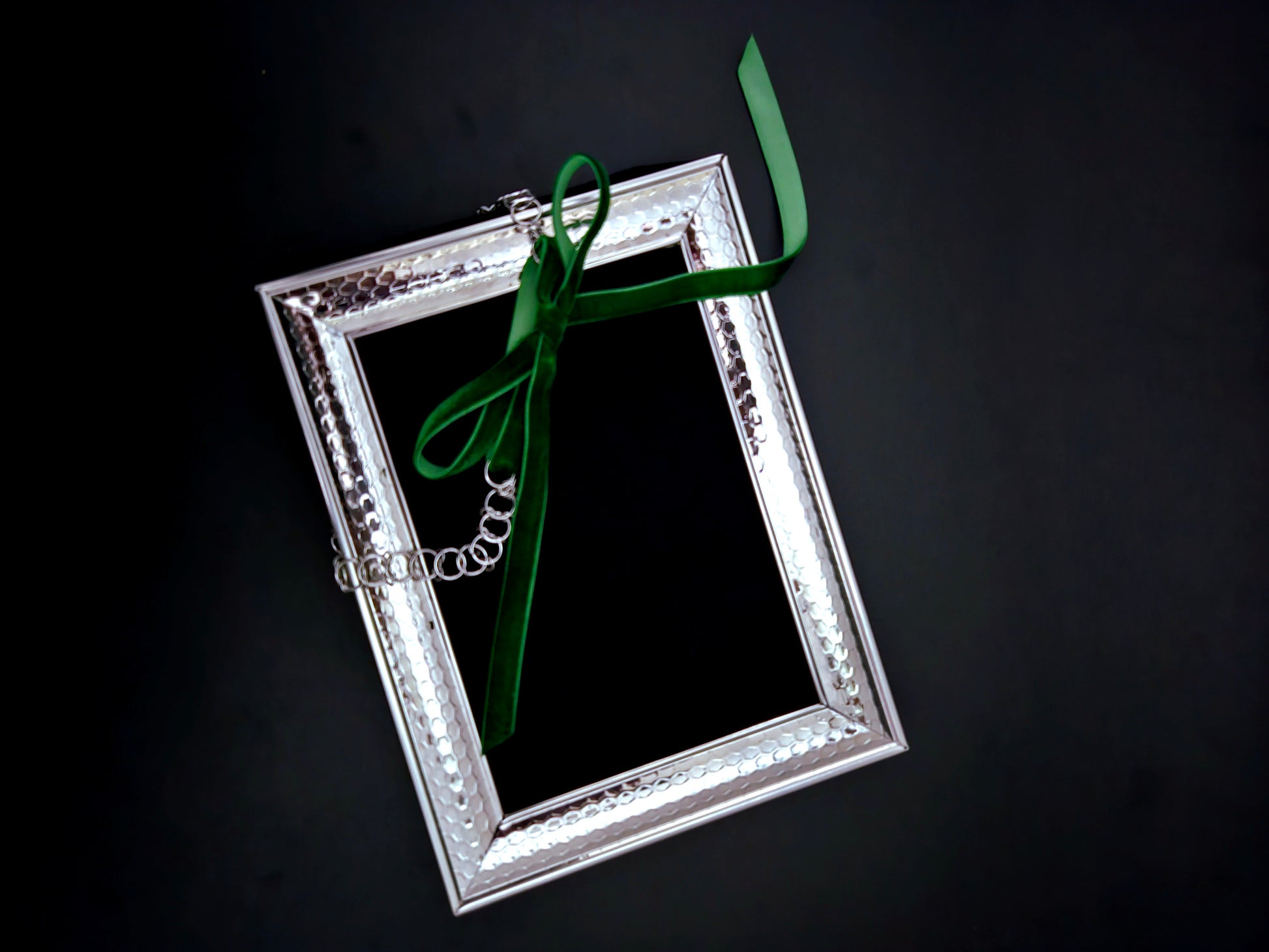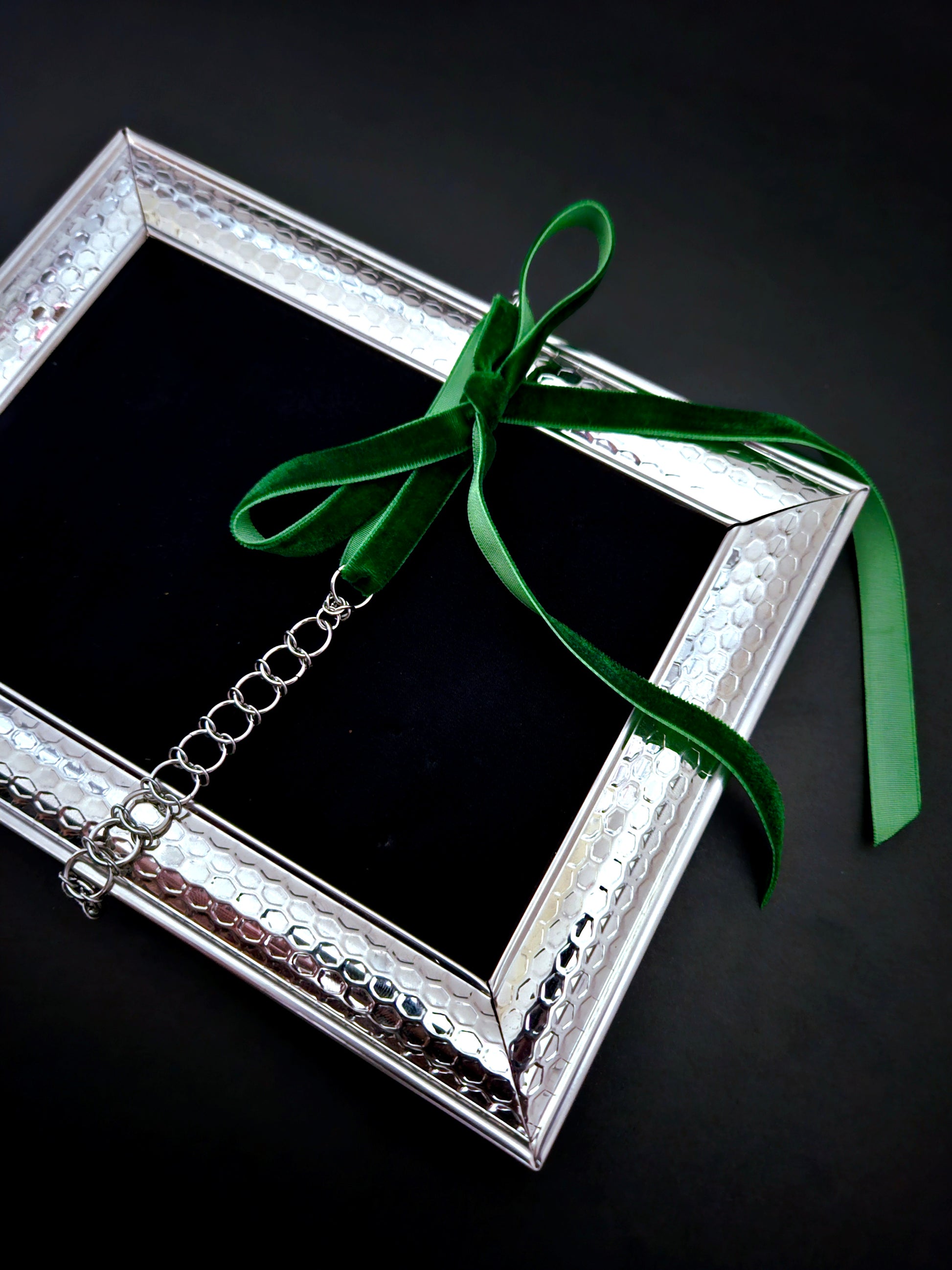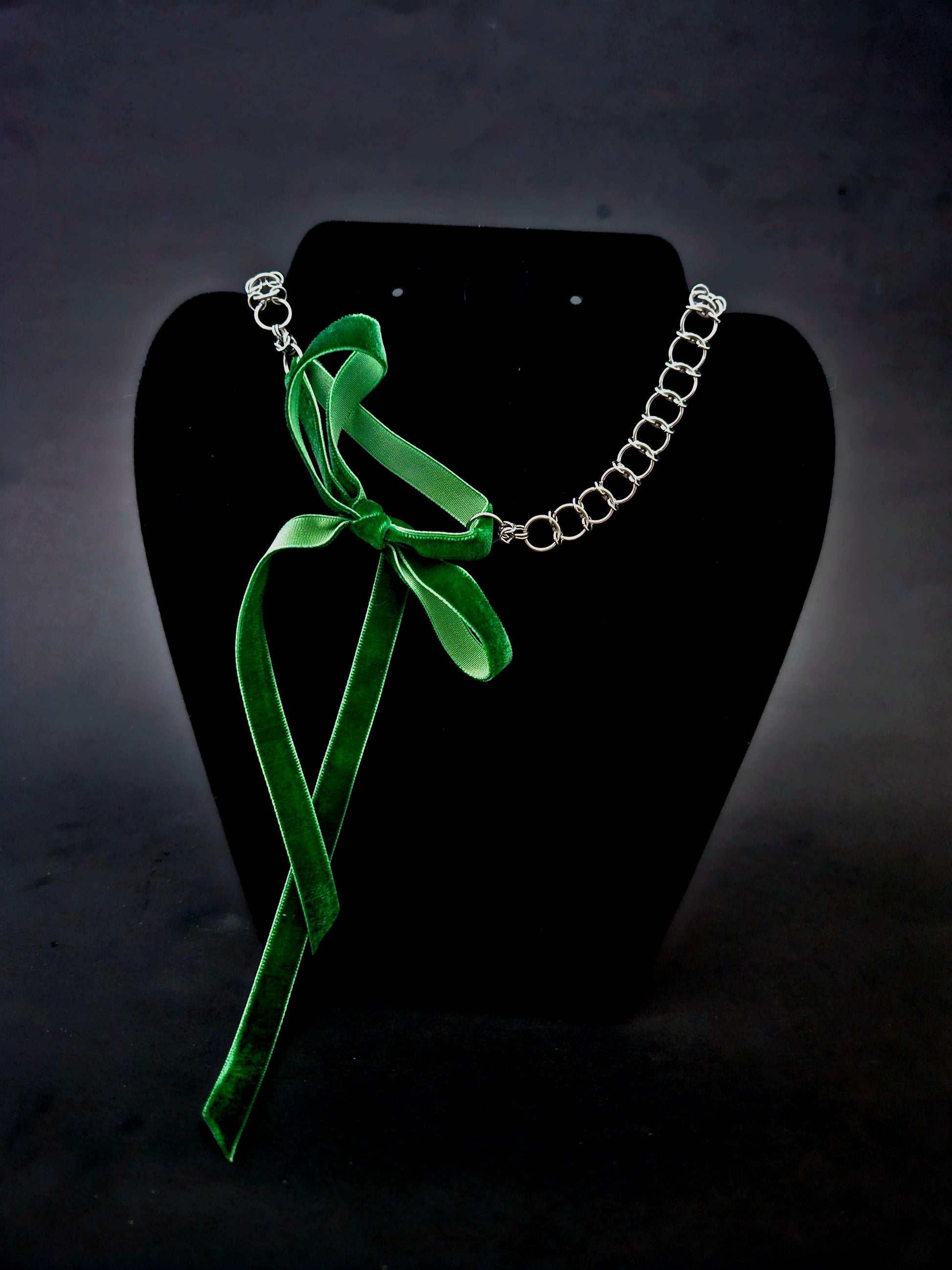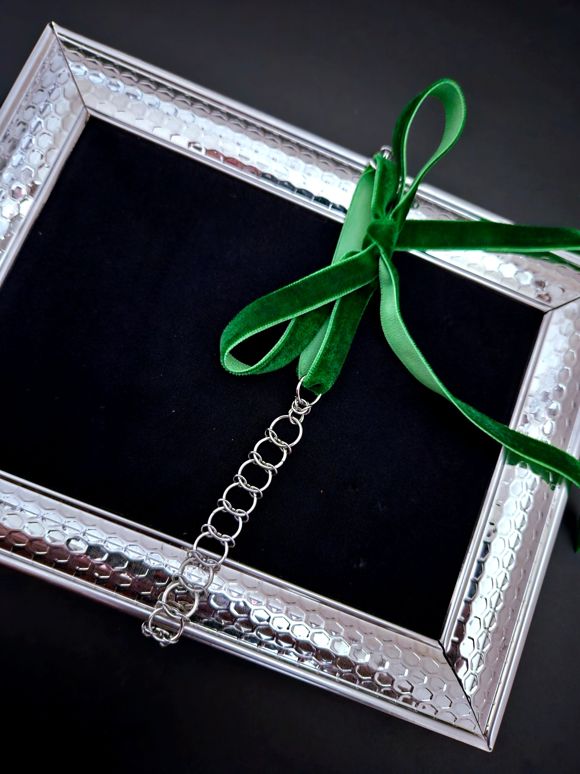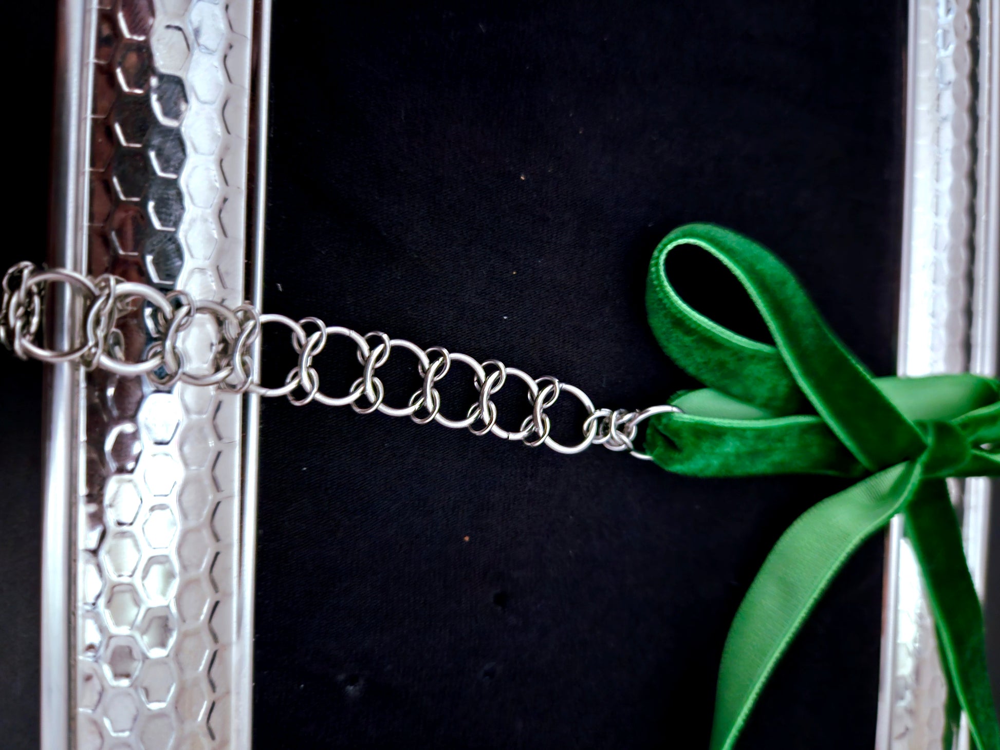 Handmade from stainless steel and velvet ribbon. Fits 14-18 inches, adjustable.