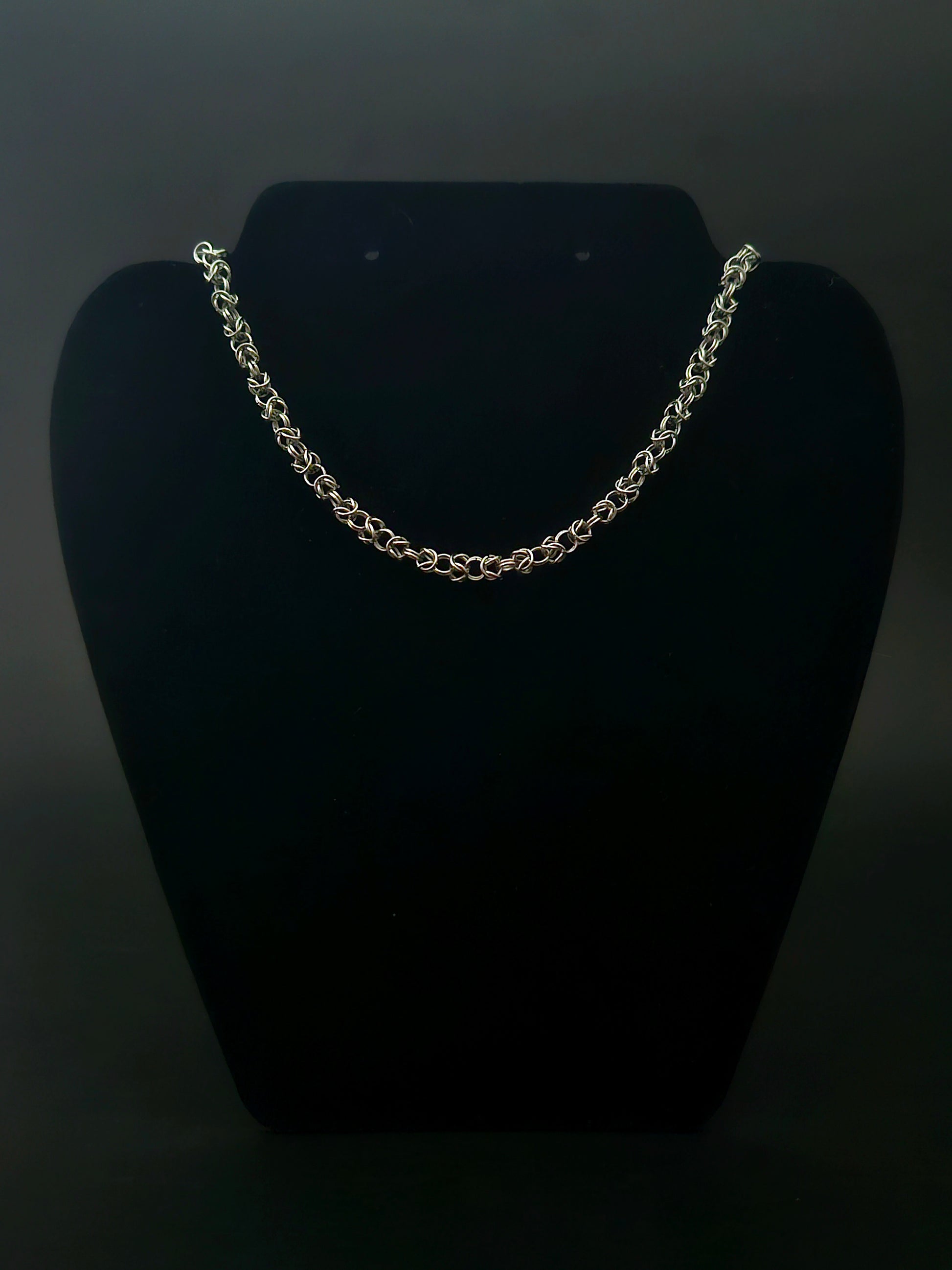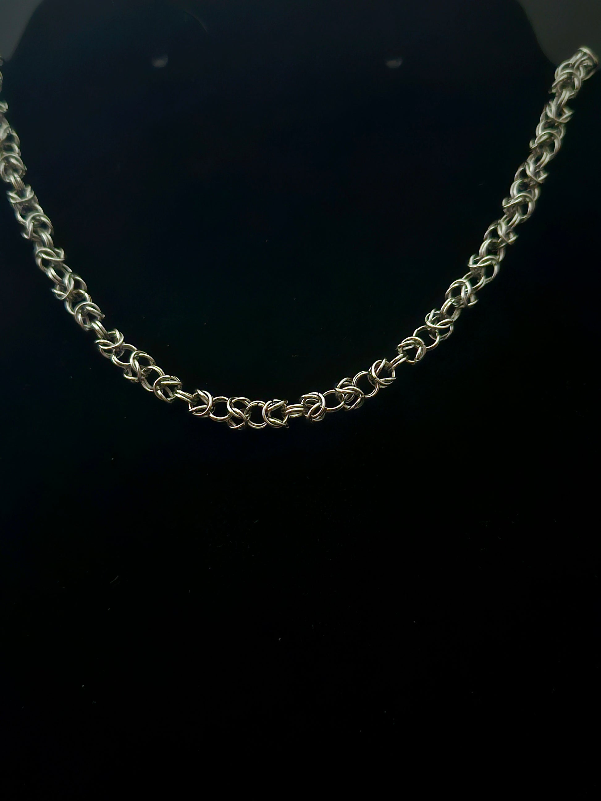The byzantine weave in smaller rings creates a beautiful three moon design to wrap around your throat under the protection of the Goddess. A quiet statement piece thats demands reverence in its simplicity.