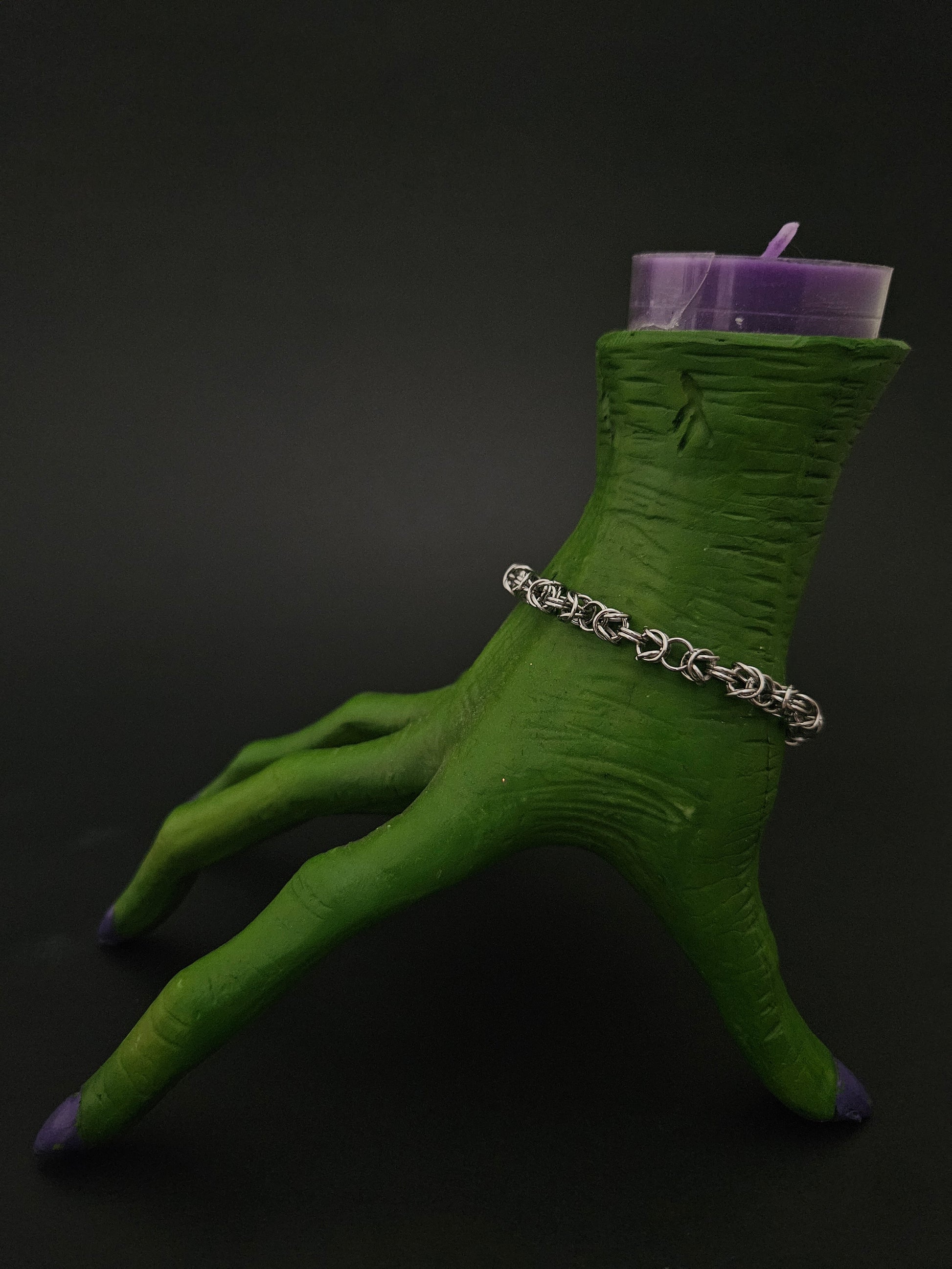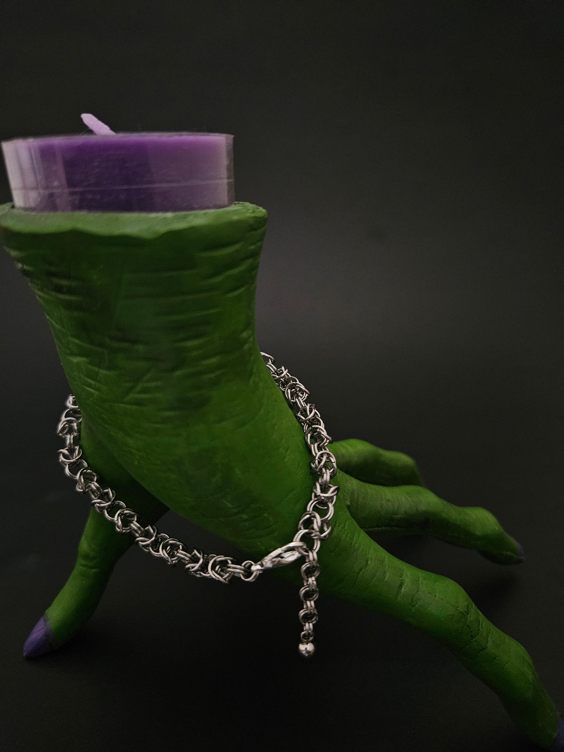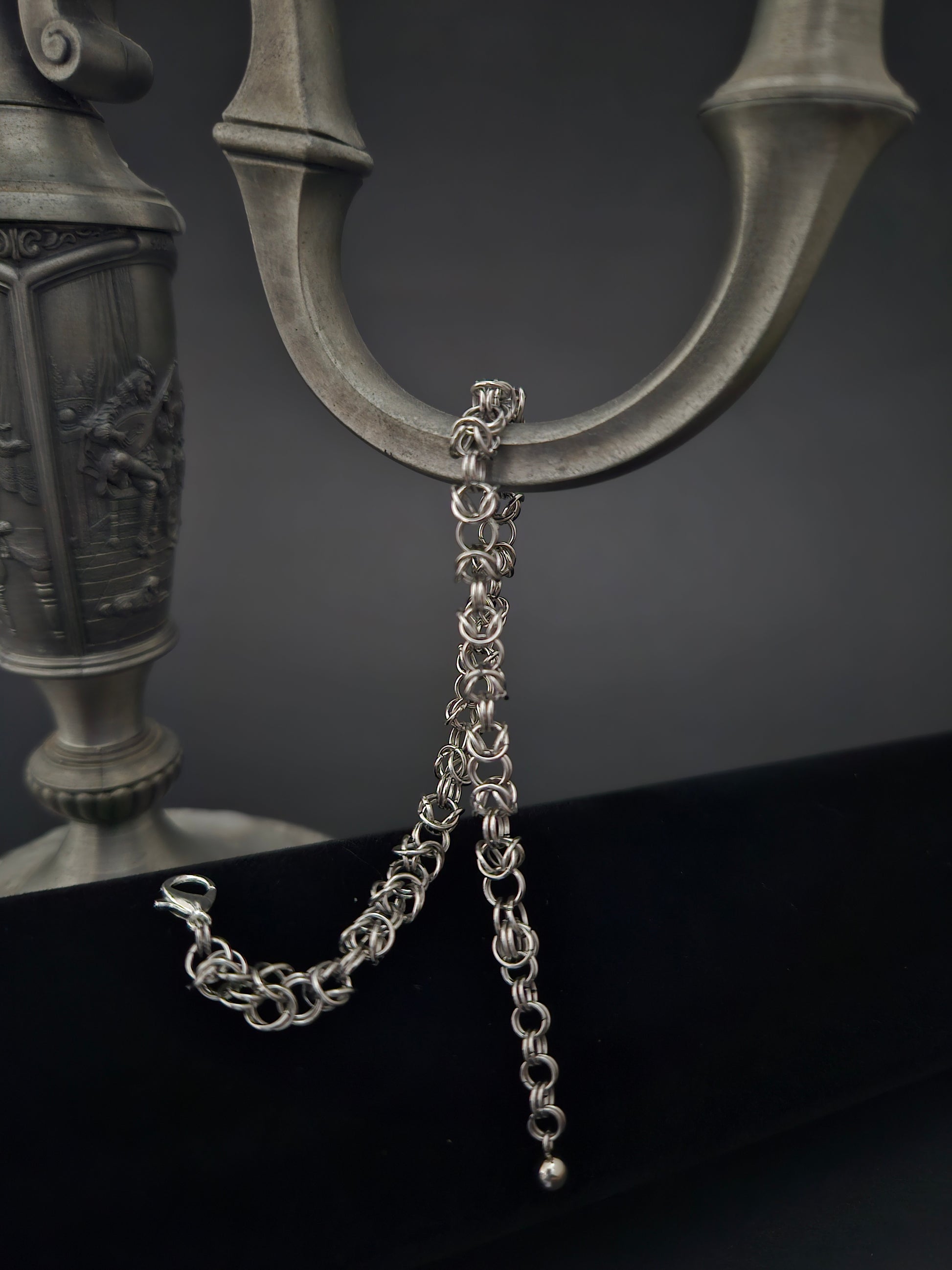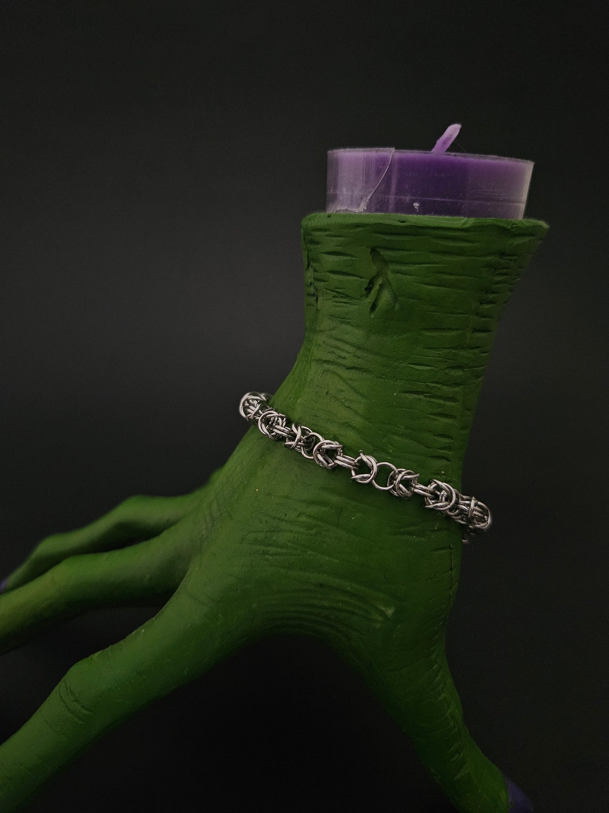 The classic hecate choker downsized to bracelet size. Byzantine weave in tiny little stainless steal rings make this a subtle bracelet with a big impact on closer look. The design creates a three moon pattern that is just so dainty standard 7 inches with classic claw clasp and 1 inch extension chain