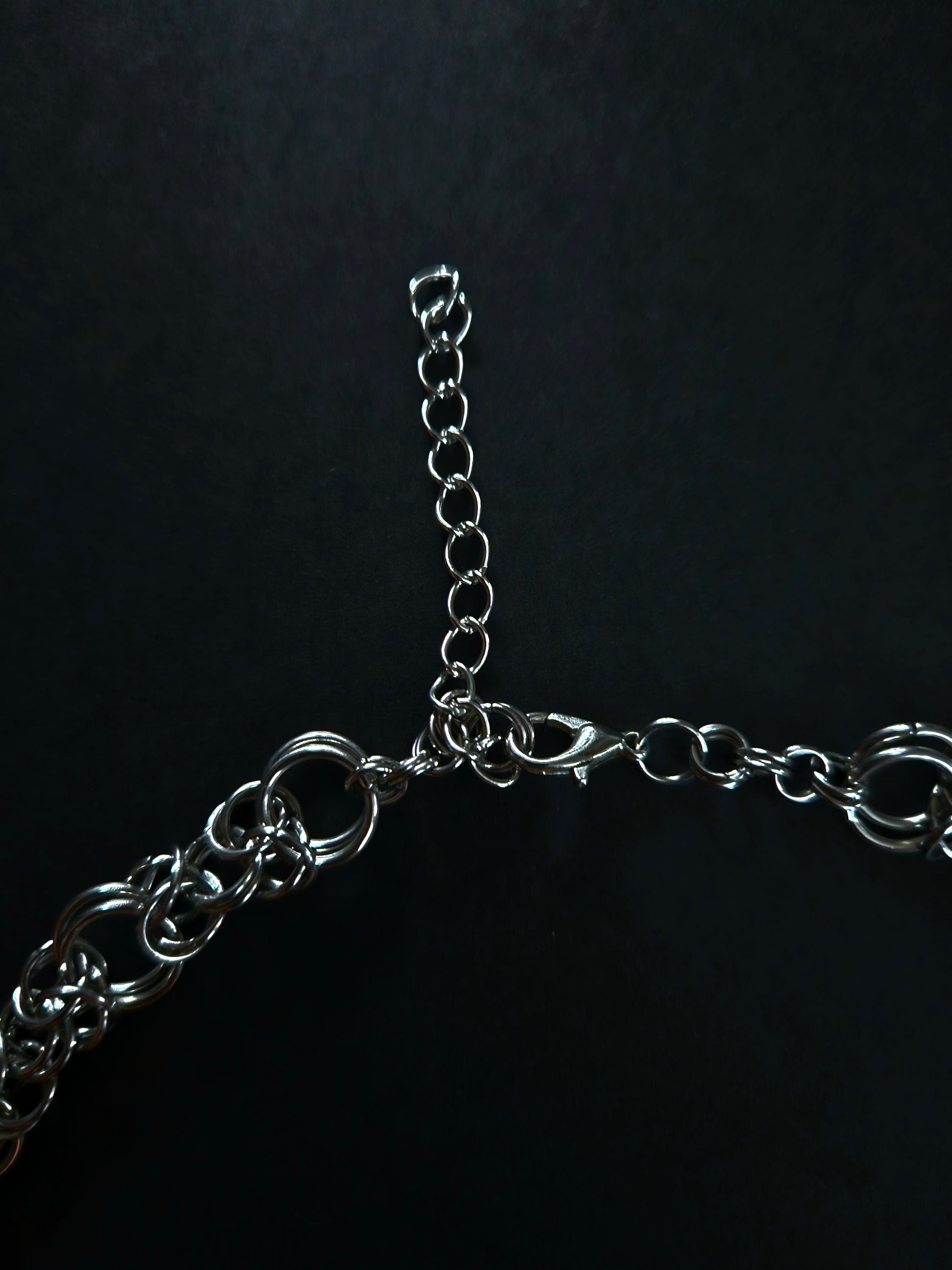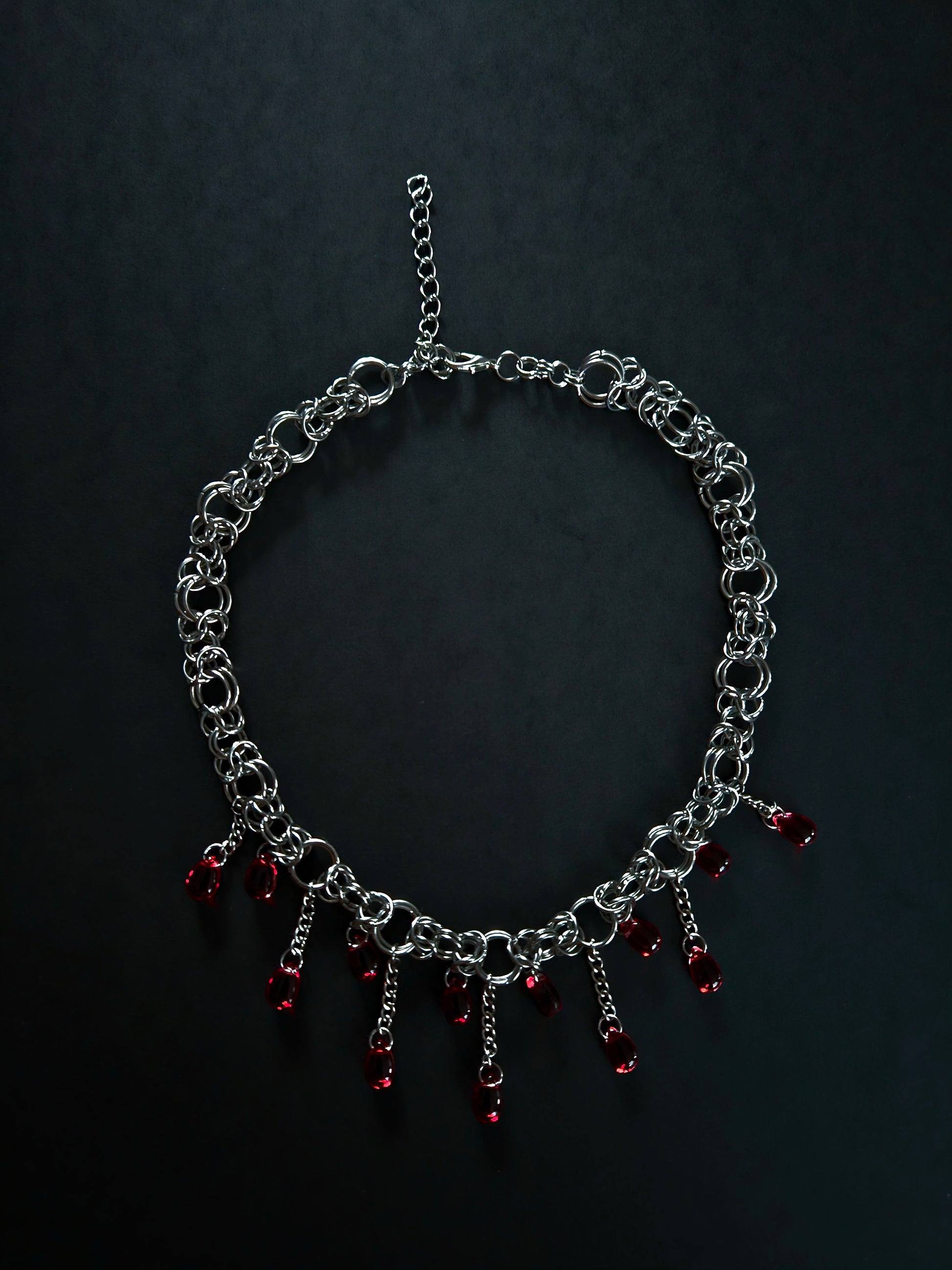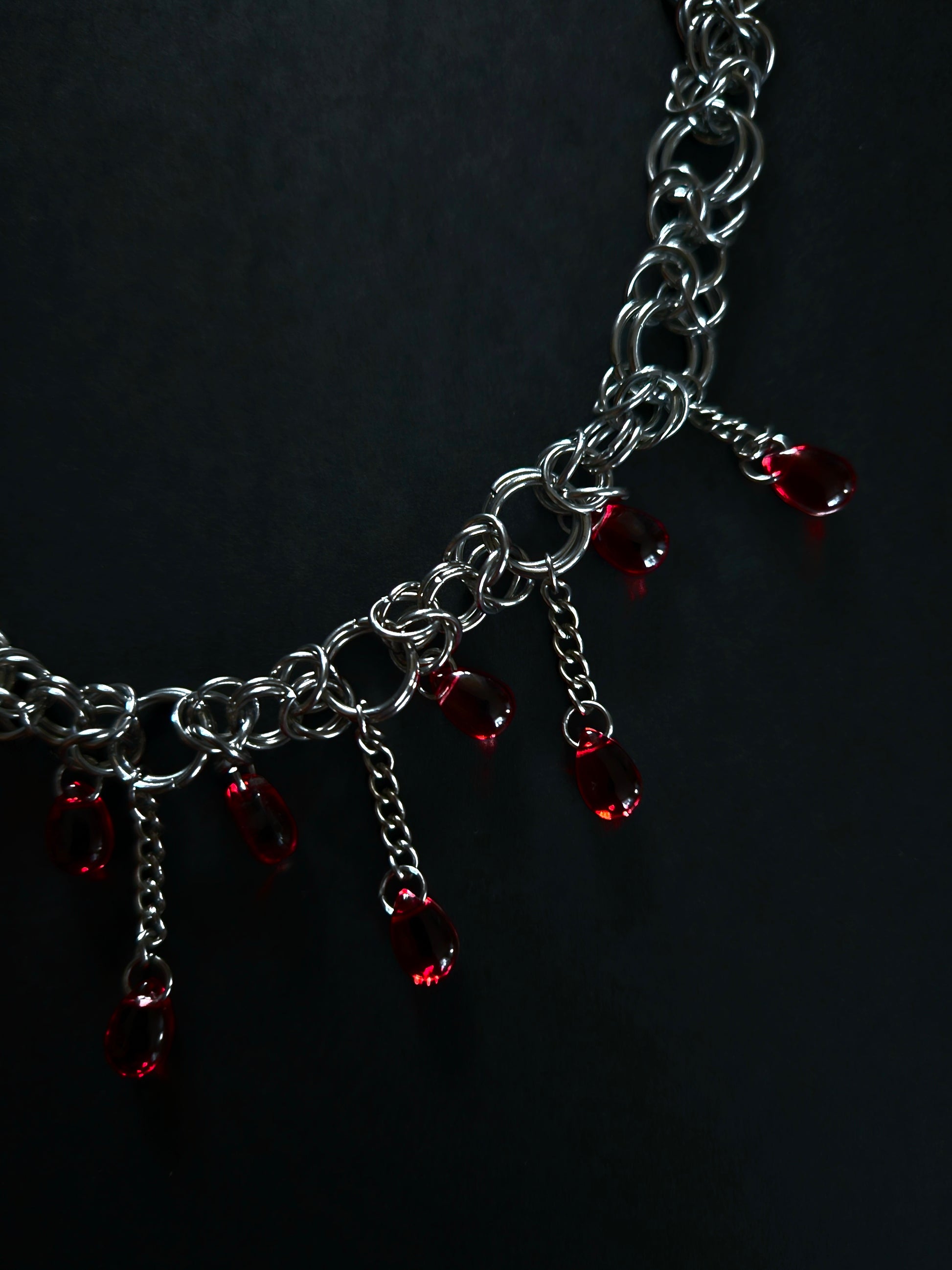 A byzantine chain woven into the triple moon shape with blood red glass tear drop beads suspended by various lengths of chain to create a bleeding illusion. Made to sit against the throat with beads hanging down mimicking the pouring of blood. Standard choker size of 14inches with claw clasp and 1.5 inch extension chain. Rings are stainless steel.