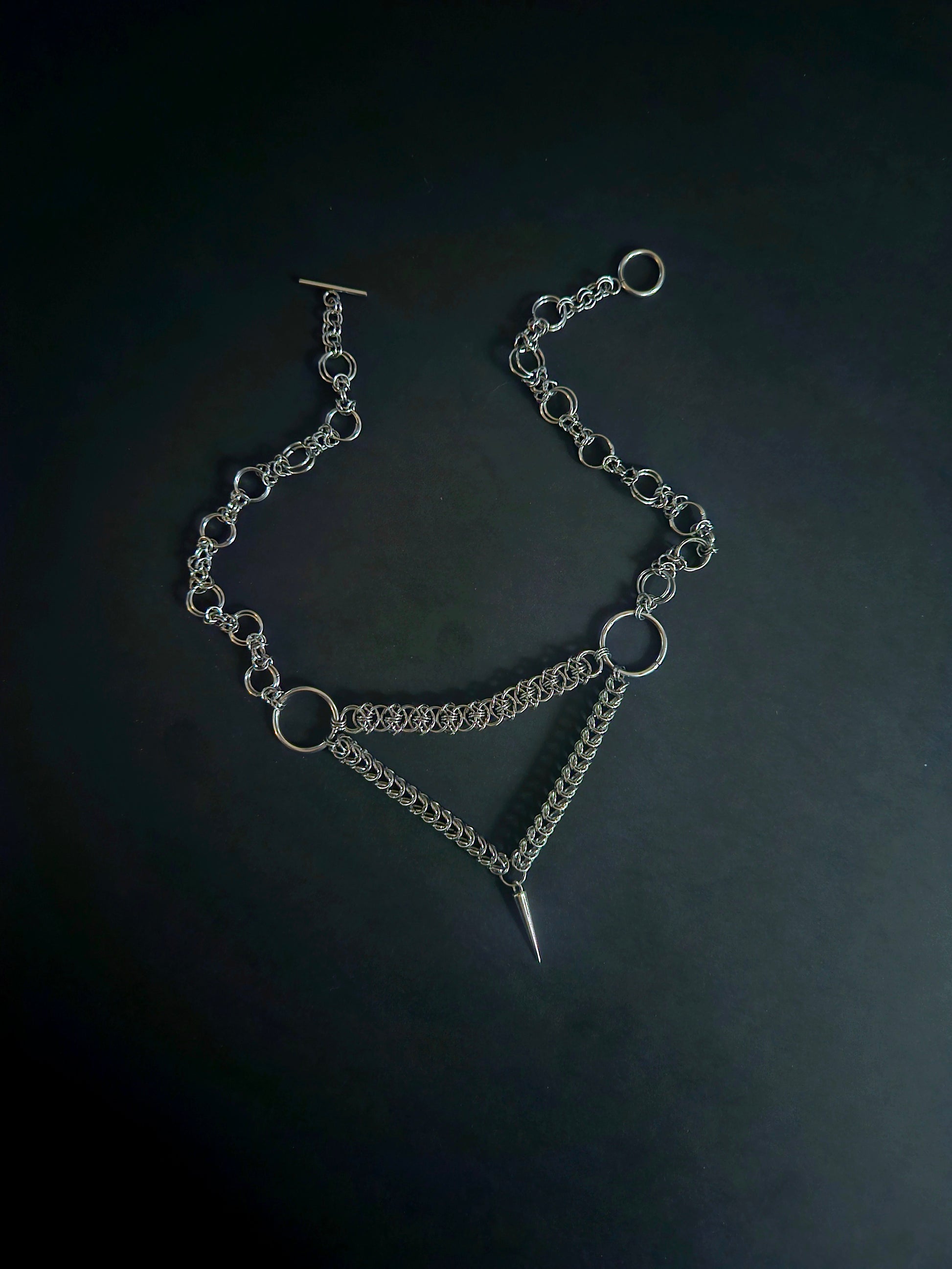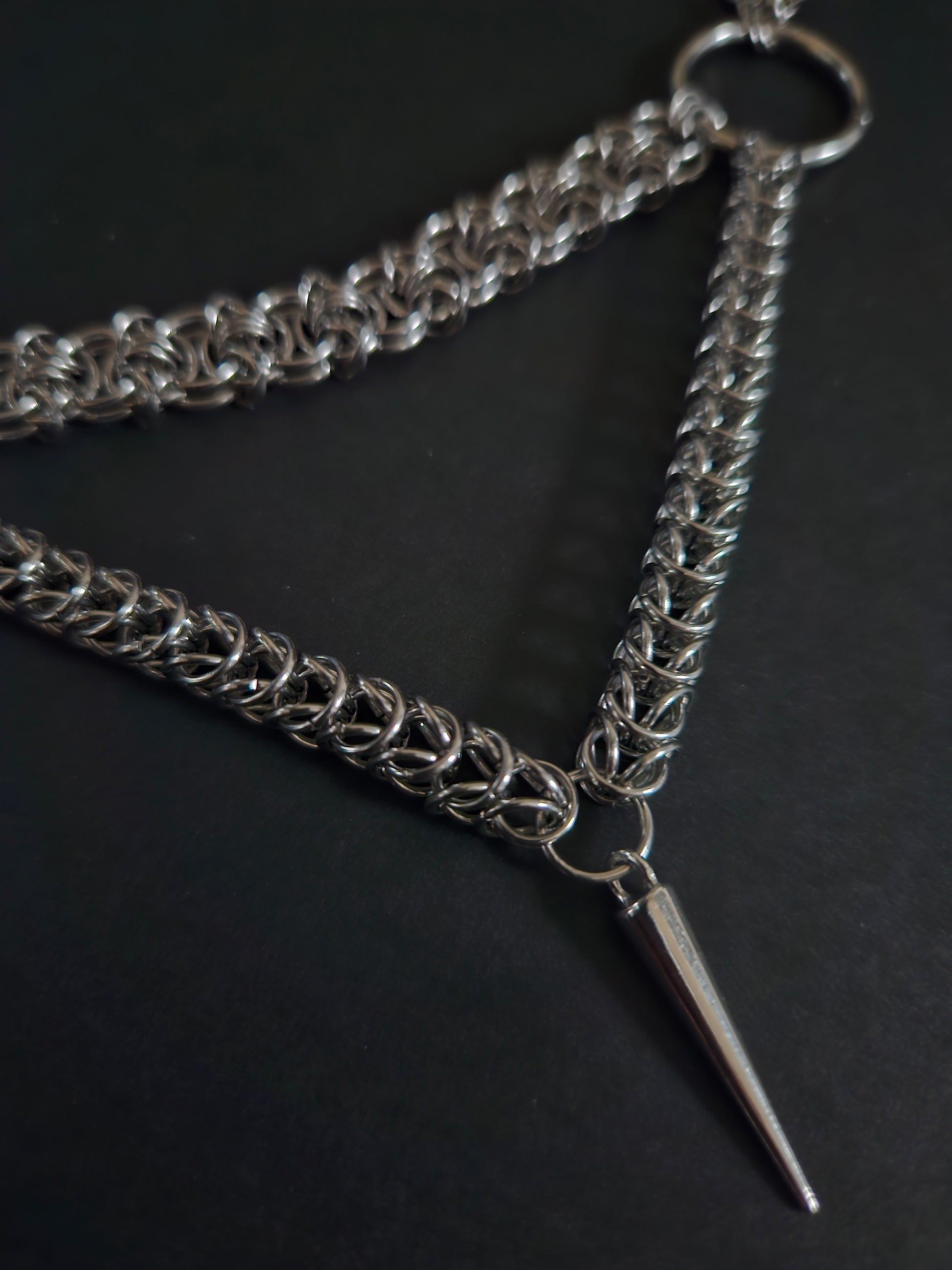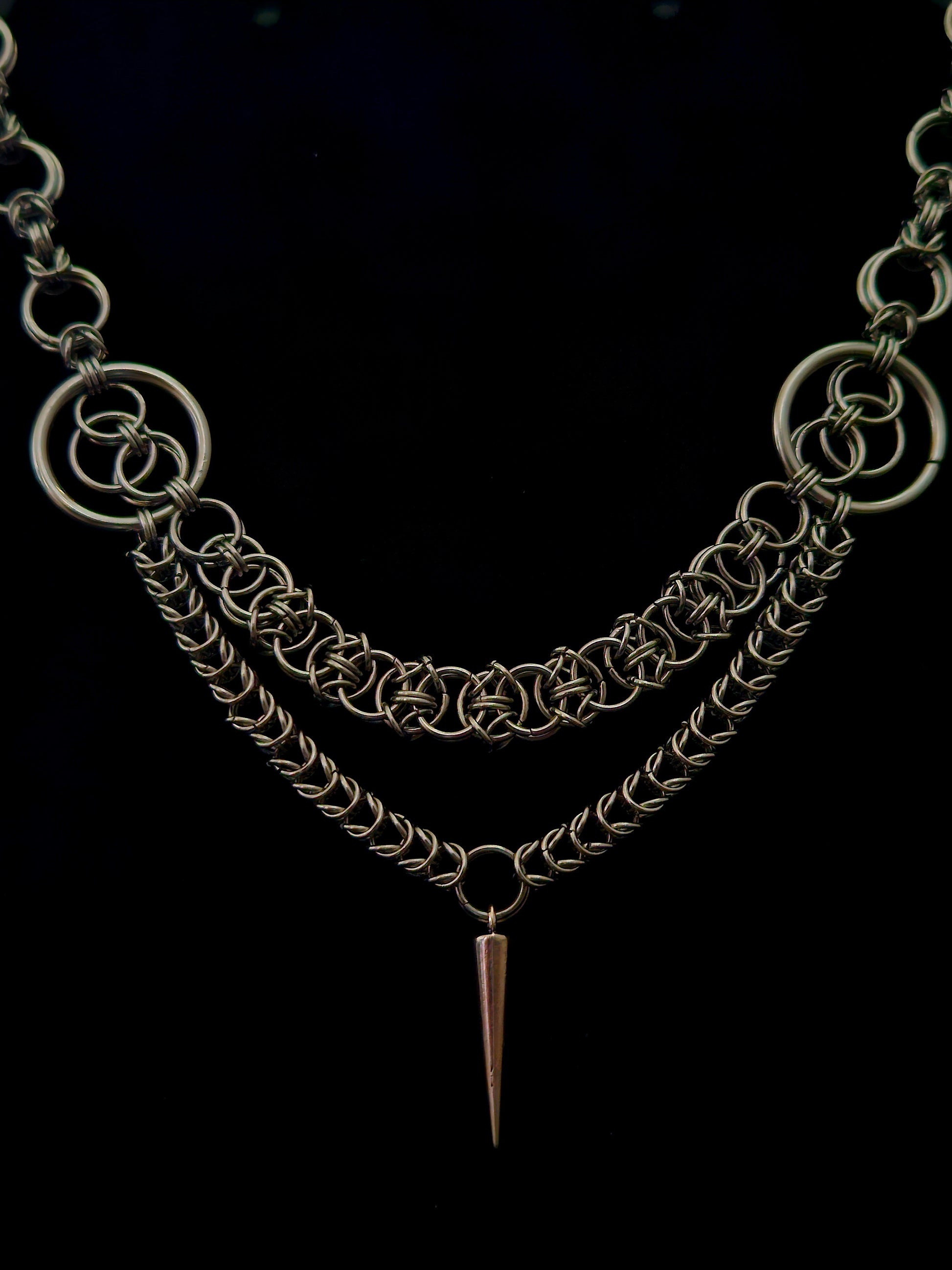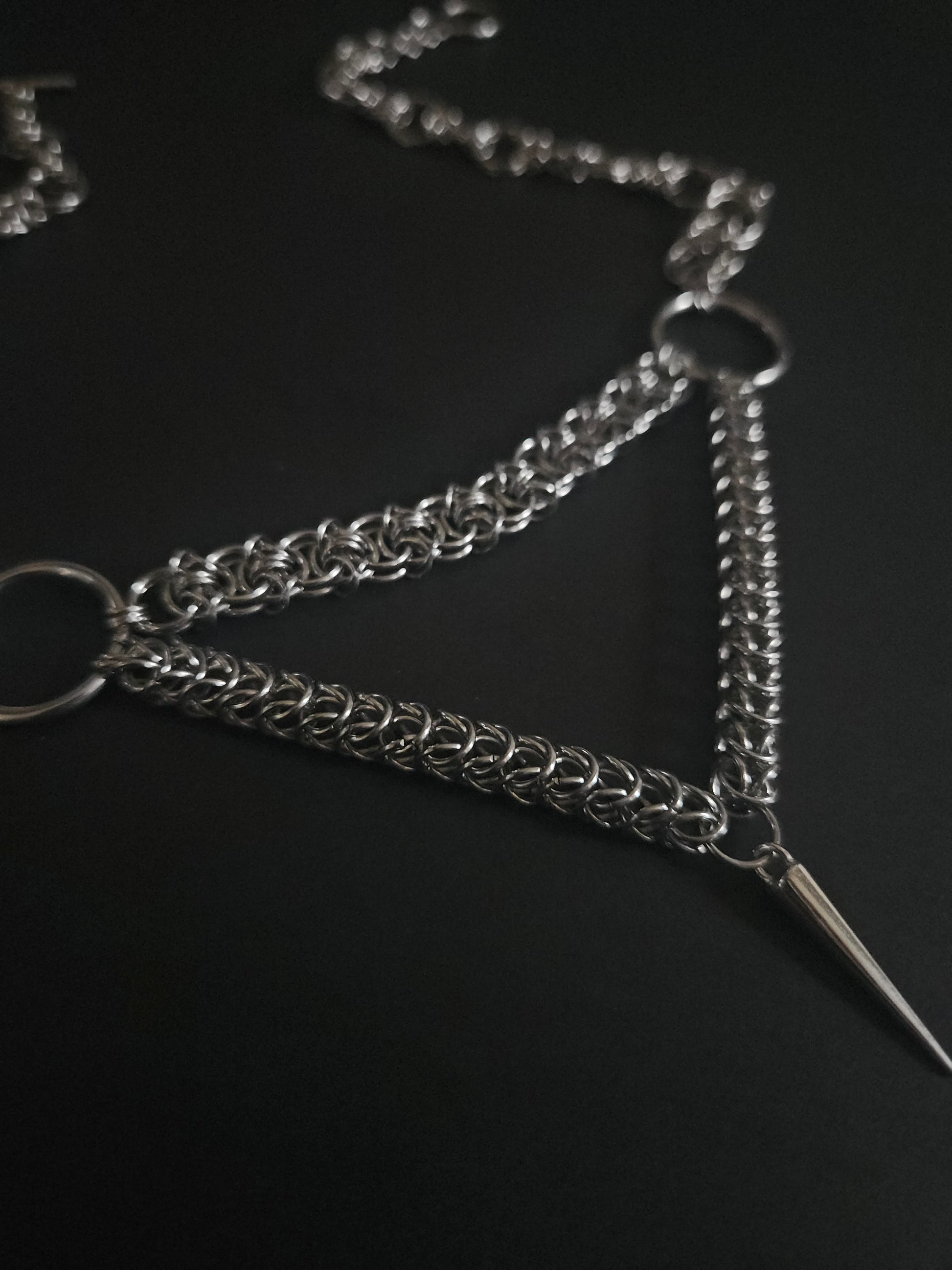 An assortment of chainmaille weaves come together to form a downward peak with a spike. Stainless steel o rings. Standard 14 inch choker with claw clasp and 1.5inch extender chain