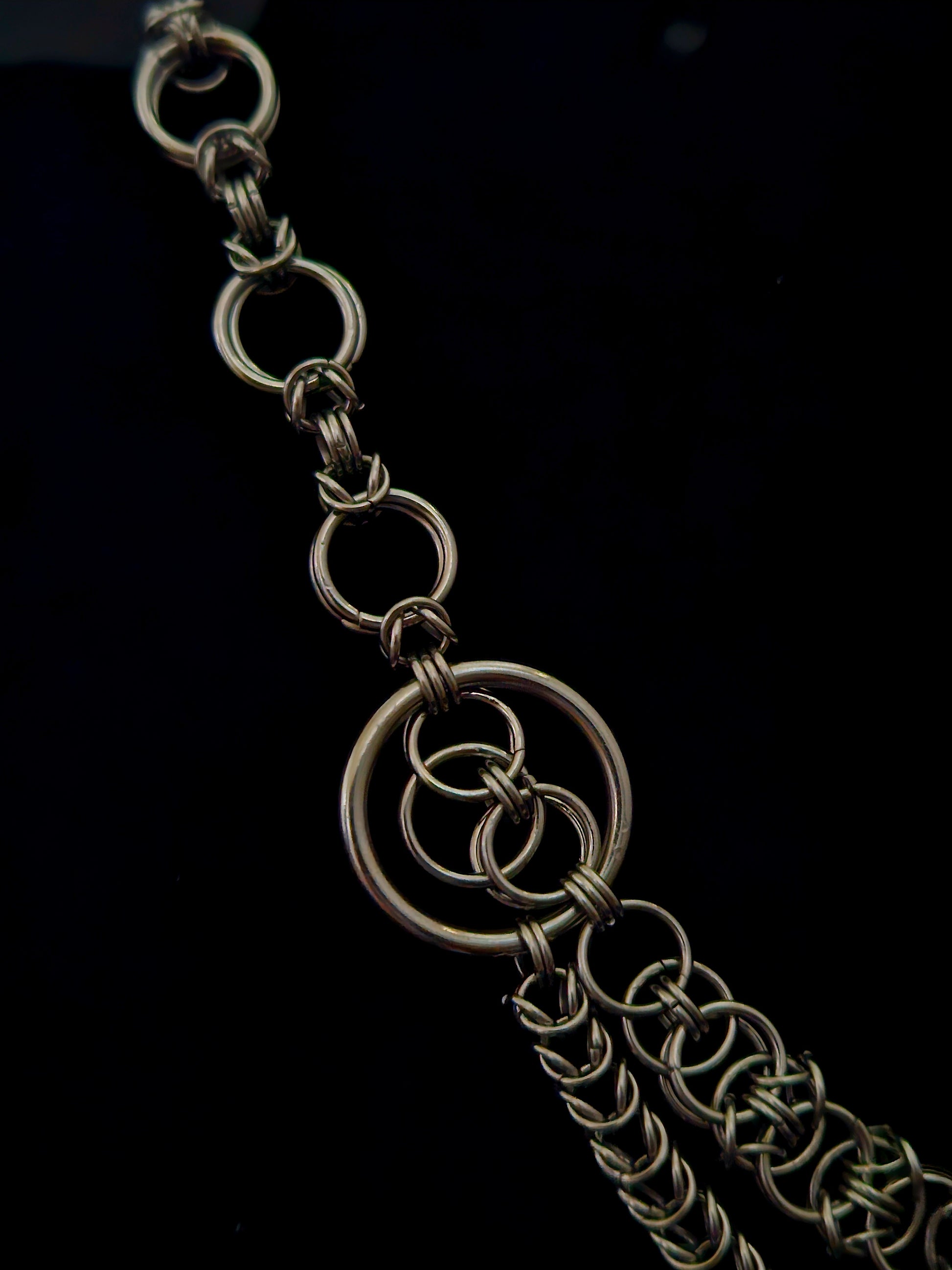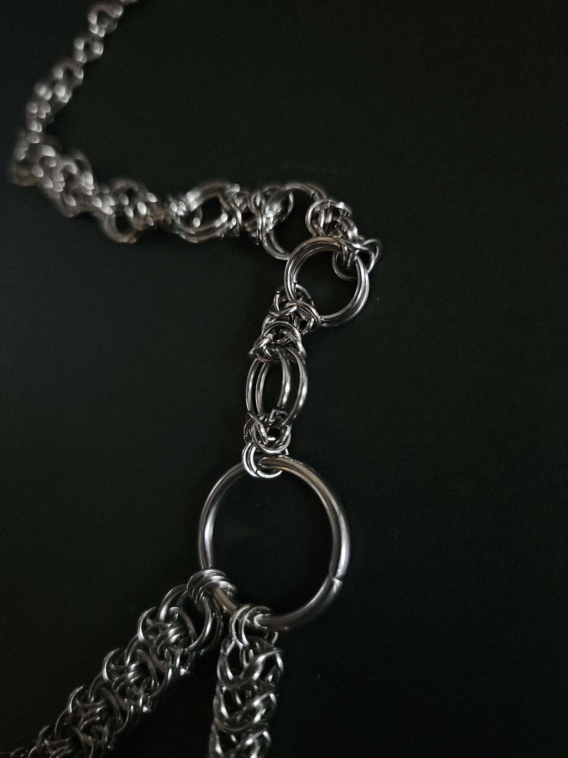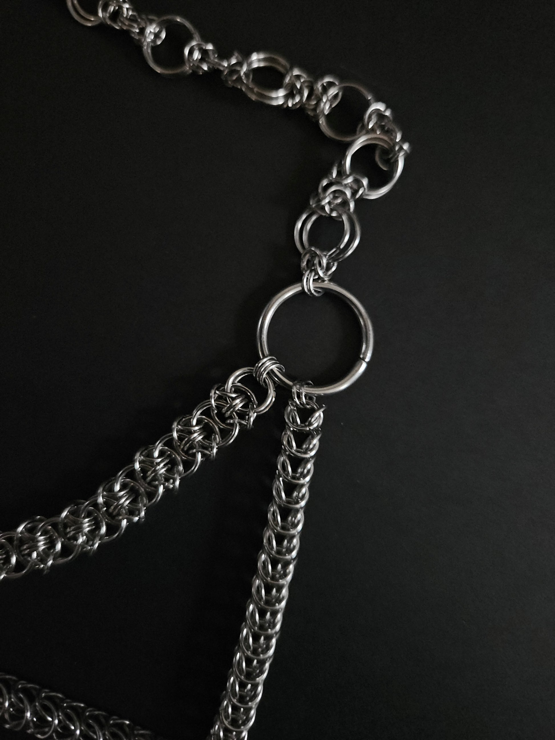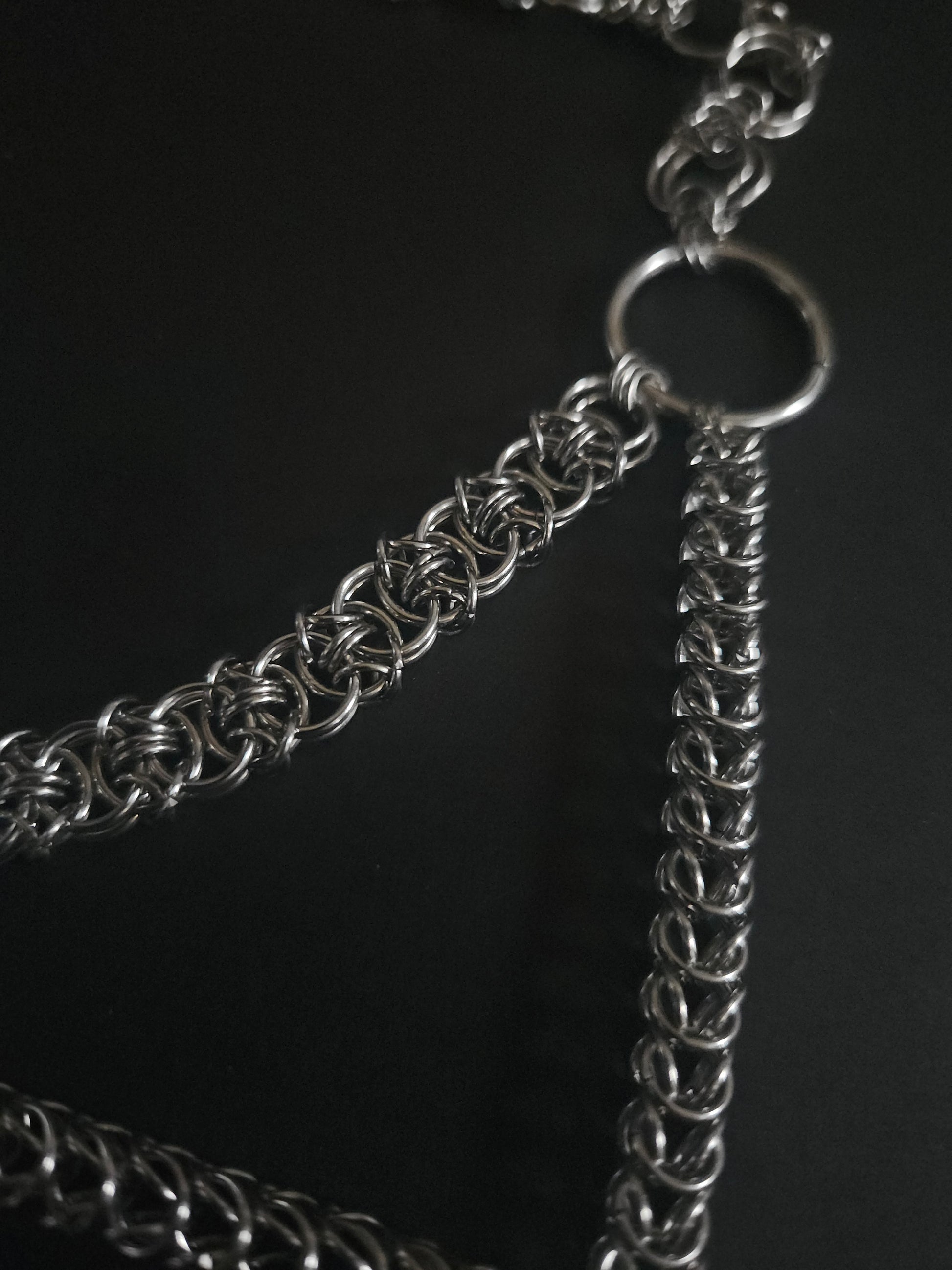 An assortment of chainmaille weaves come together to form a downward peak with a spike. Stainless steel o rings. Standard 14 inch choker with claw clasp and 1.5inch extender chain