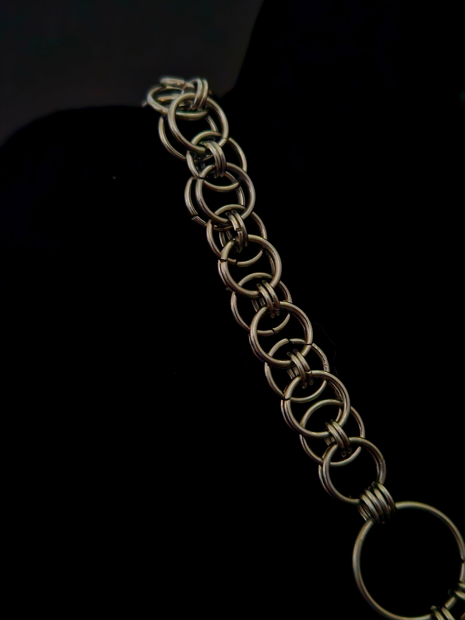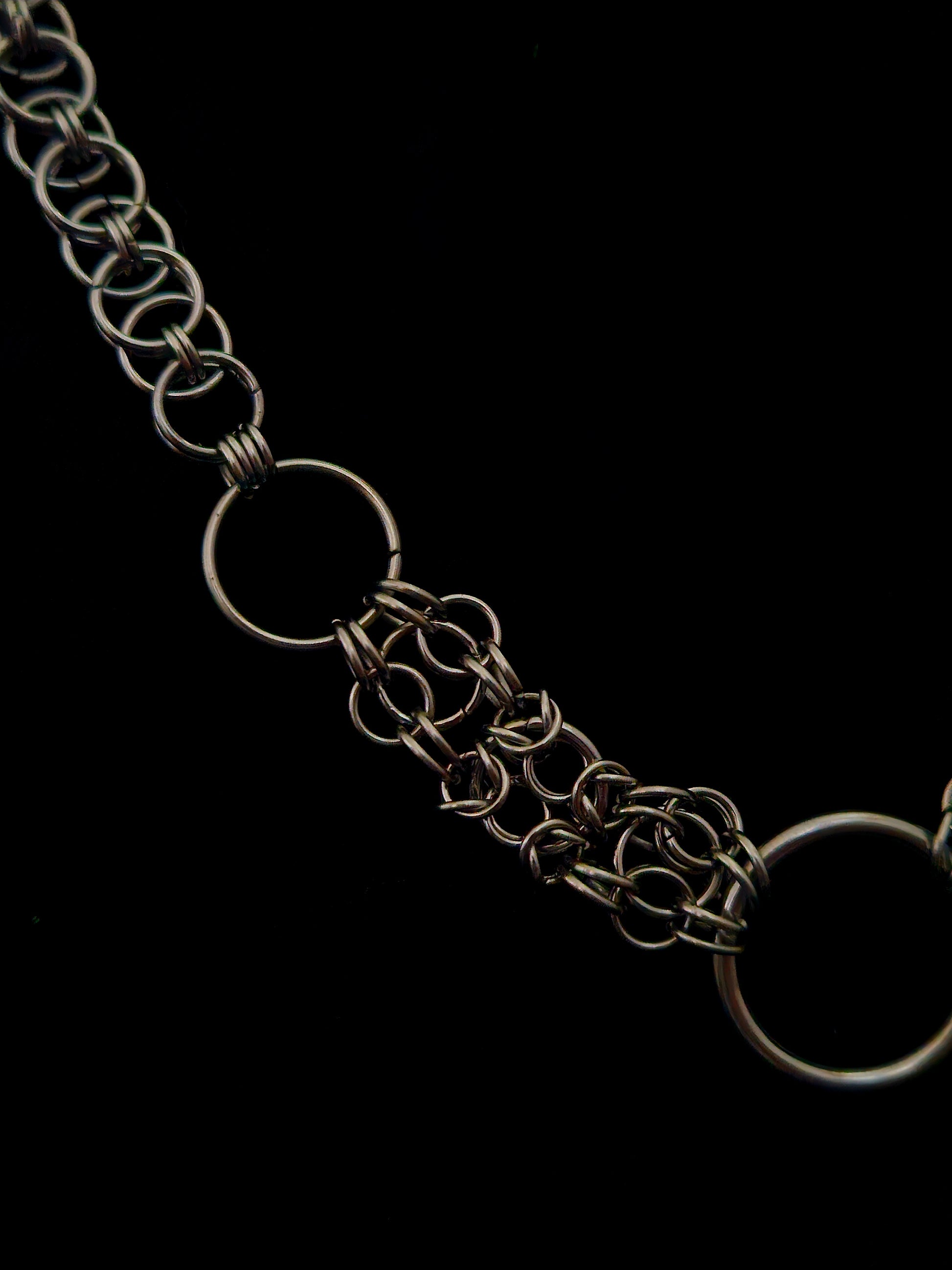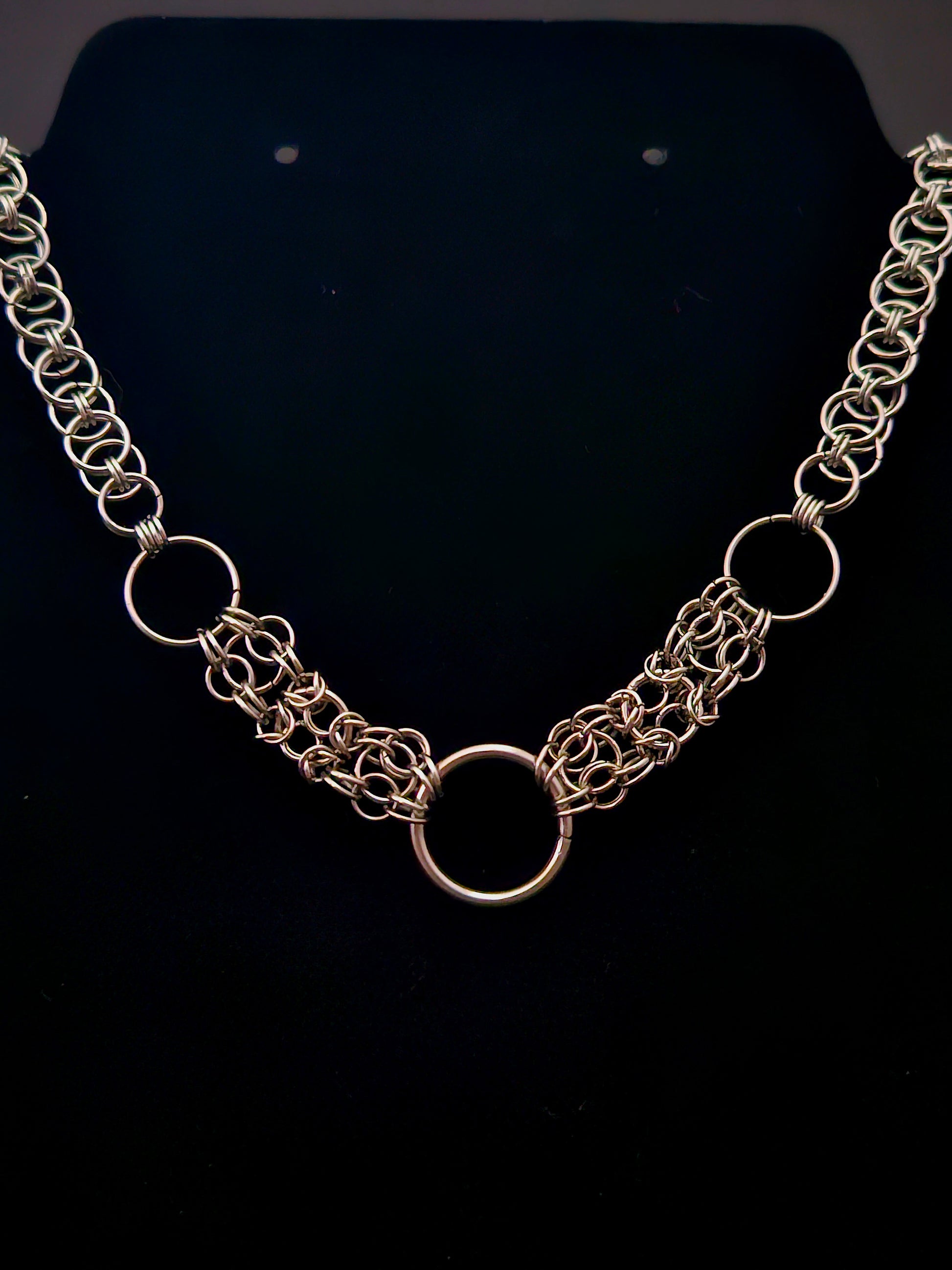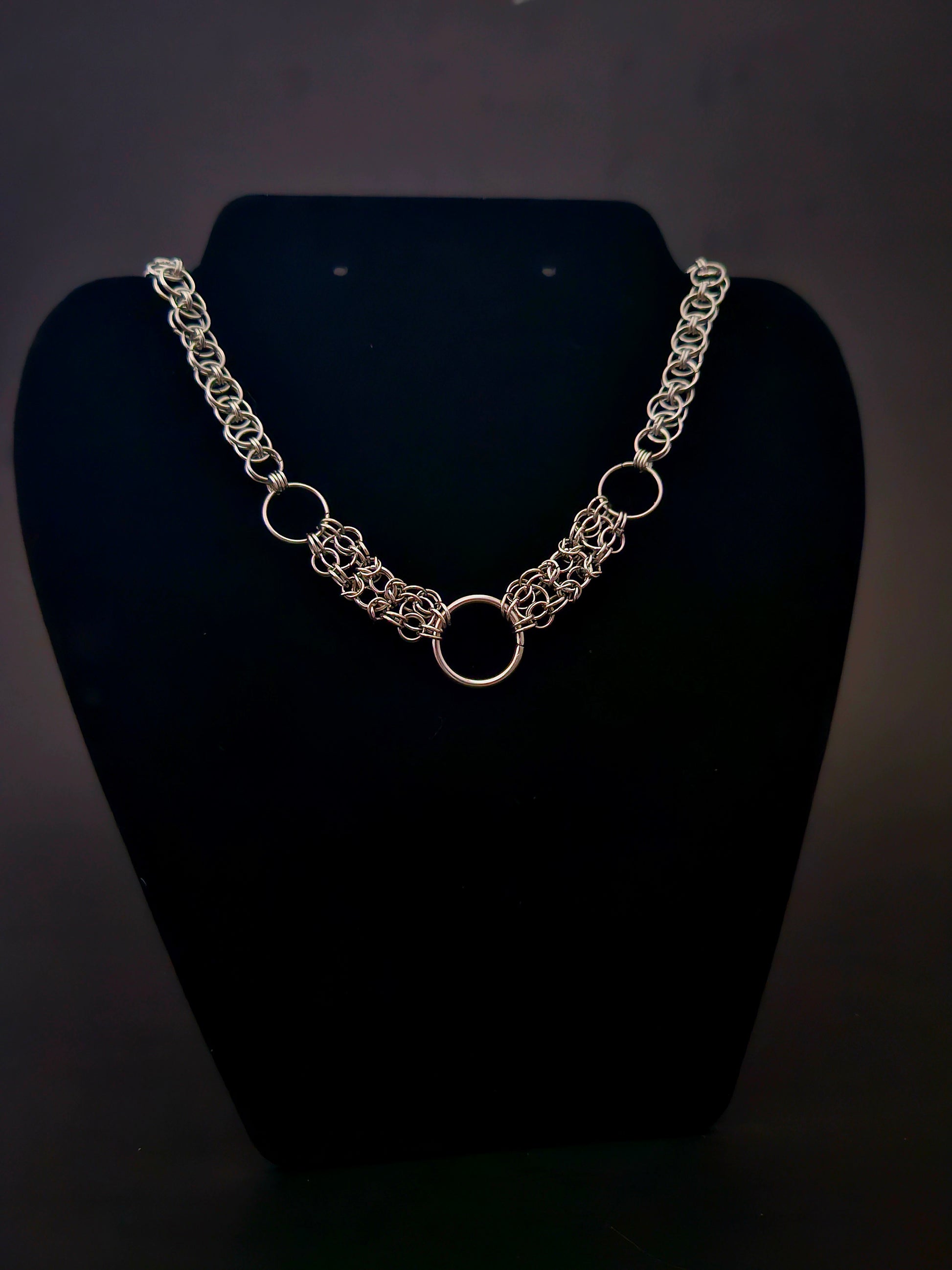 3 large o rights with modified byzantine and helm chain. Standard 14 inch choker with claw clasp and 1.5 inch extender chain. Stainless steel.