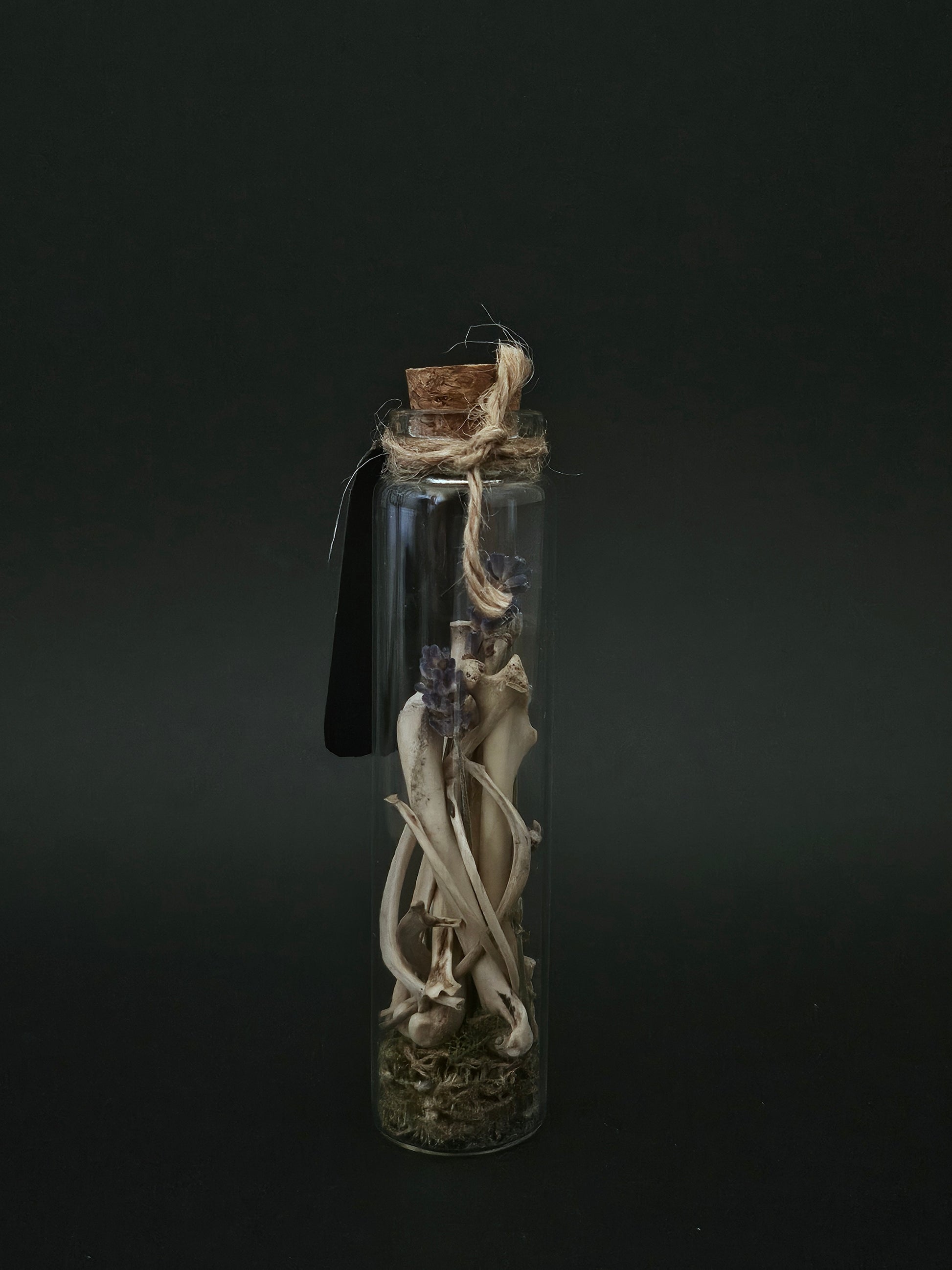 Medium size jar with real moss, dried lavender and assorted real muskrat bones. Capped with a cork lid. All items are real and preserved in house. Ethically and sustainably sourced. Cork not sealed, able to open jar.