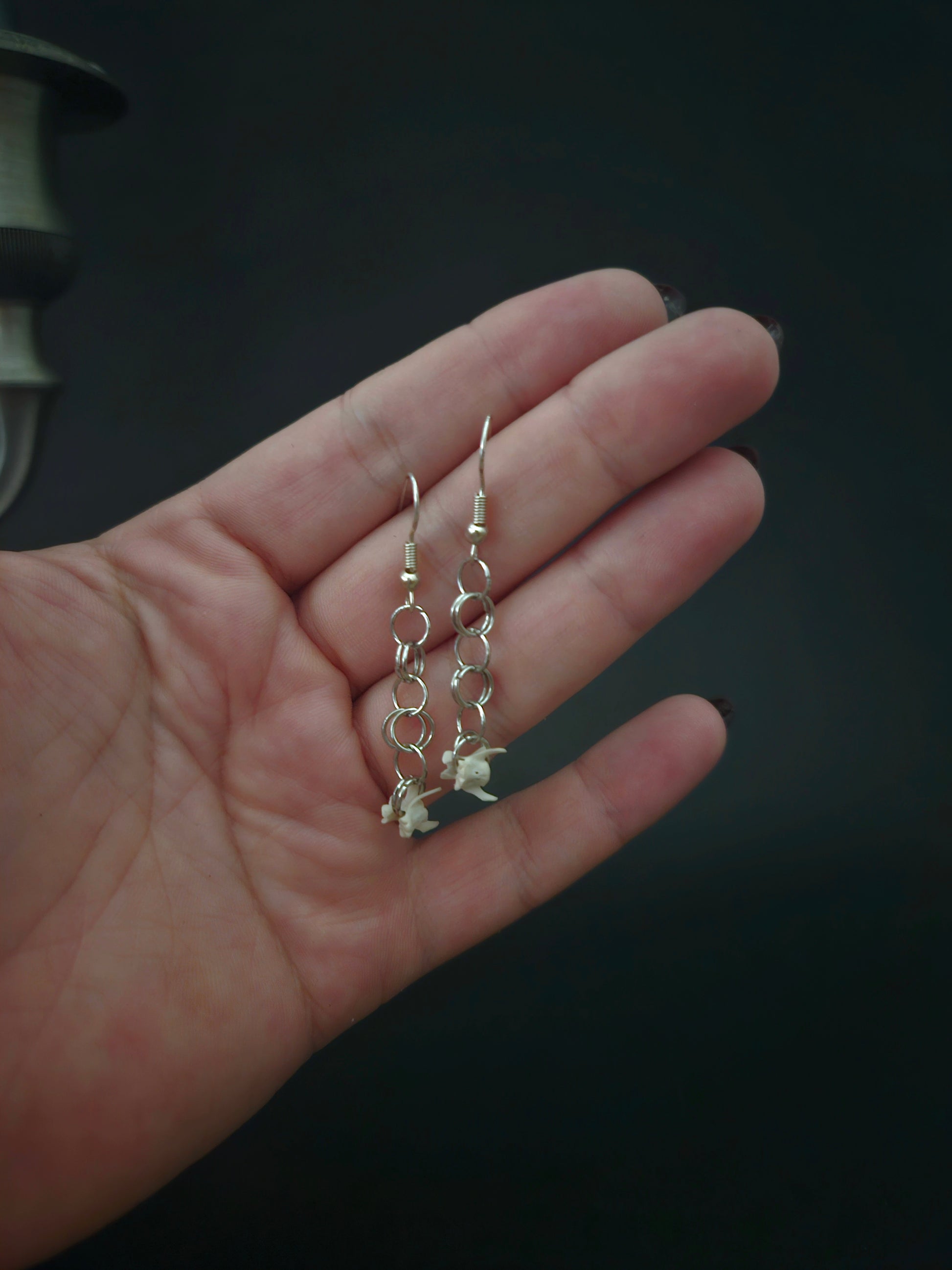 Two rat vertebrae sit at the end of a basic stainless steel chainmaille weave. Hook style earrings made of stainless steel.