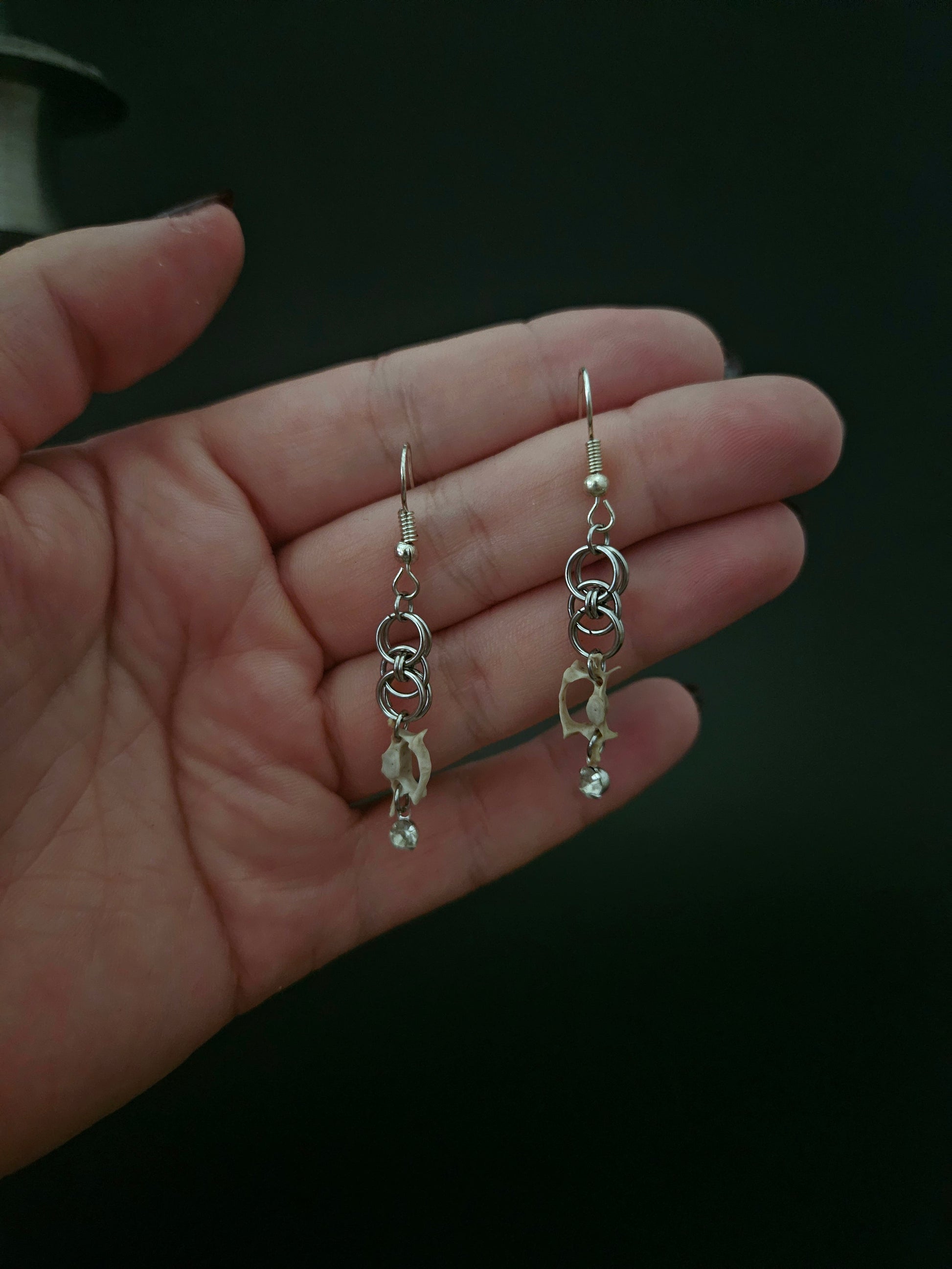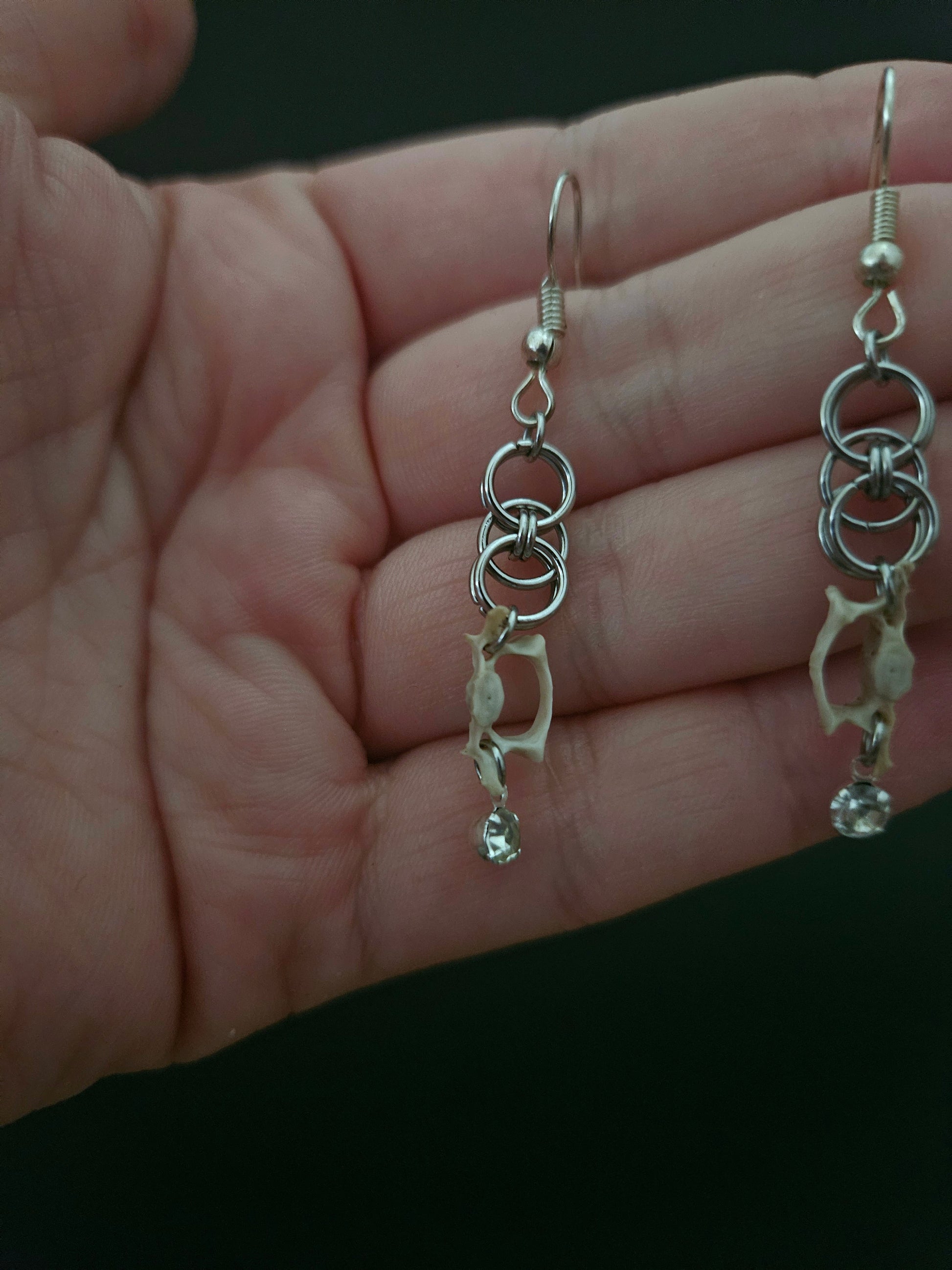 Helm weave stainless steel chainmail on stainless steel hook style earrings. A real rat vertebrae and faux diamond dangles at the bottom.
