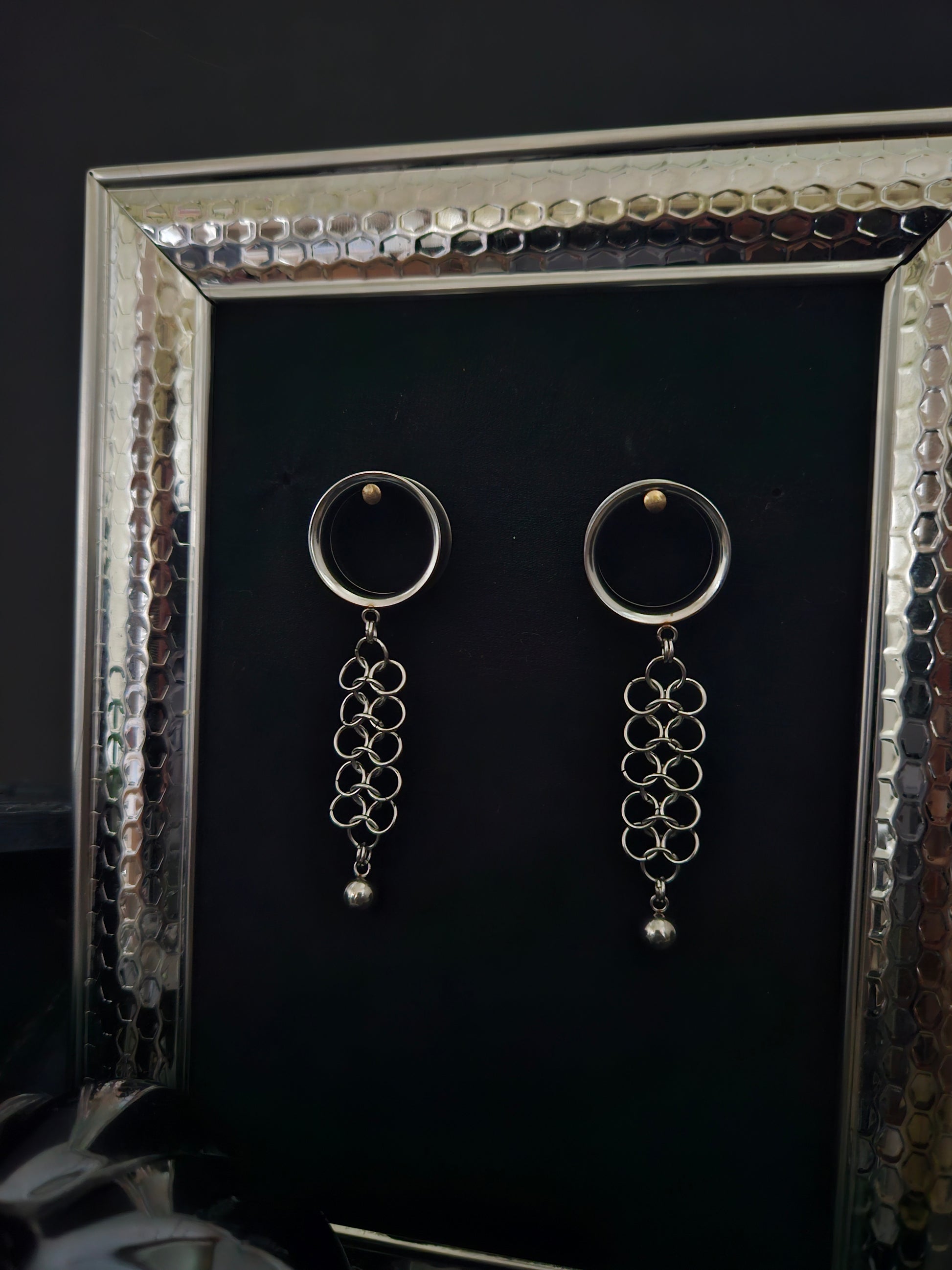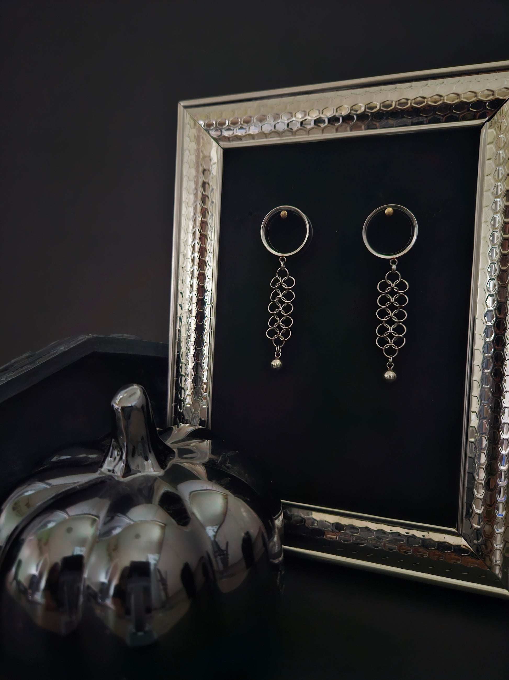 A ladder weave of European 4 in 1 made with stainless steel o rings and a stainless steel ball charm. Climb down to the underworld with a coin for the ferry man. Shown on 7/8 size tunnels. Stainless steel tunnels double flared with screw on back flare