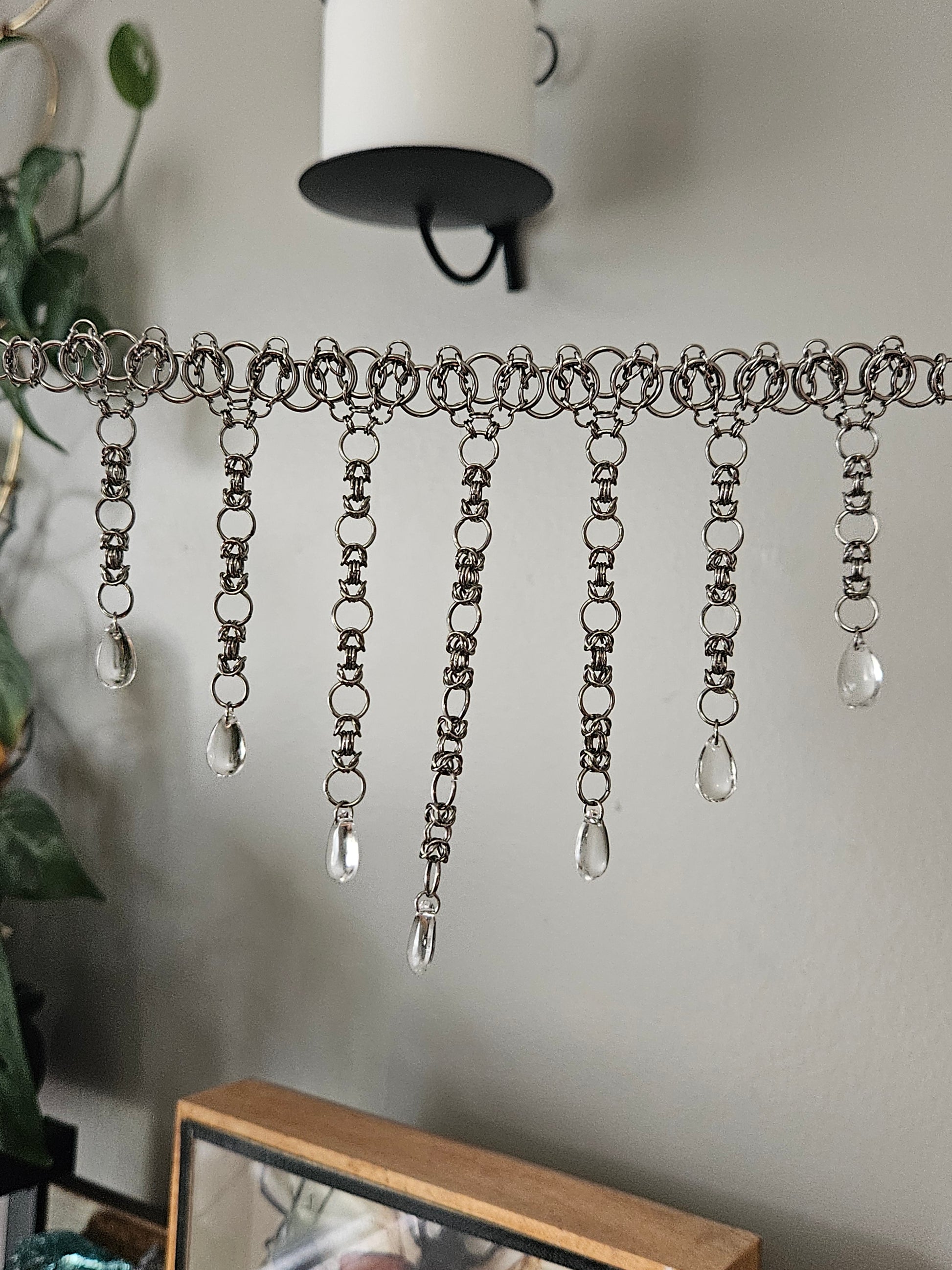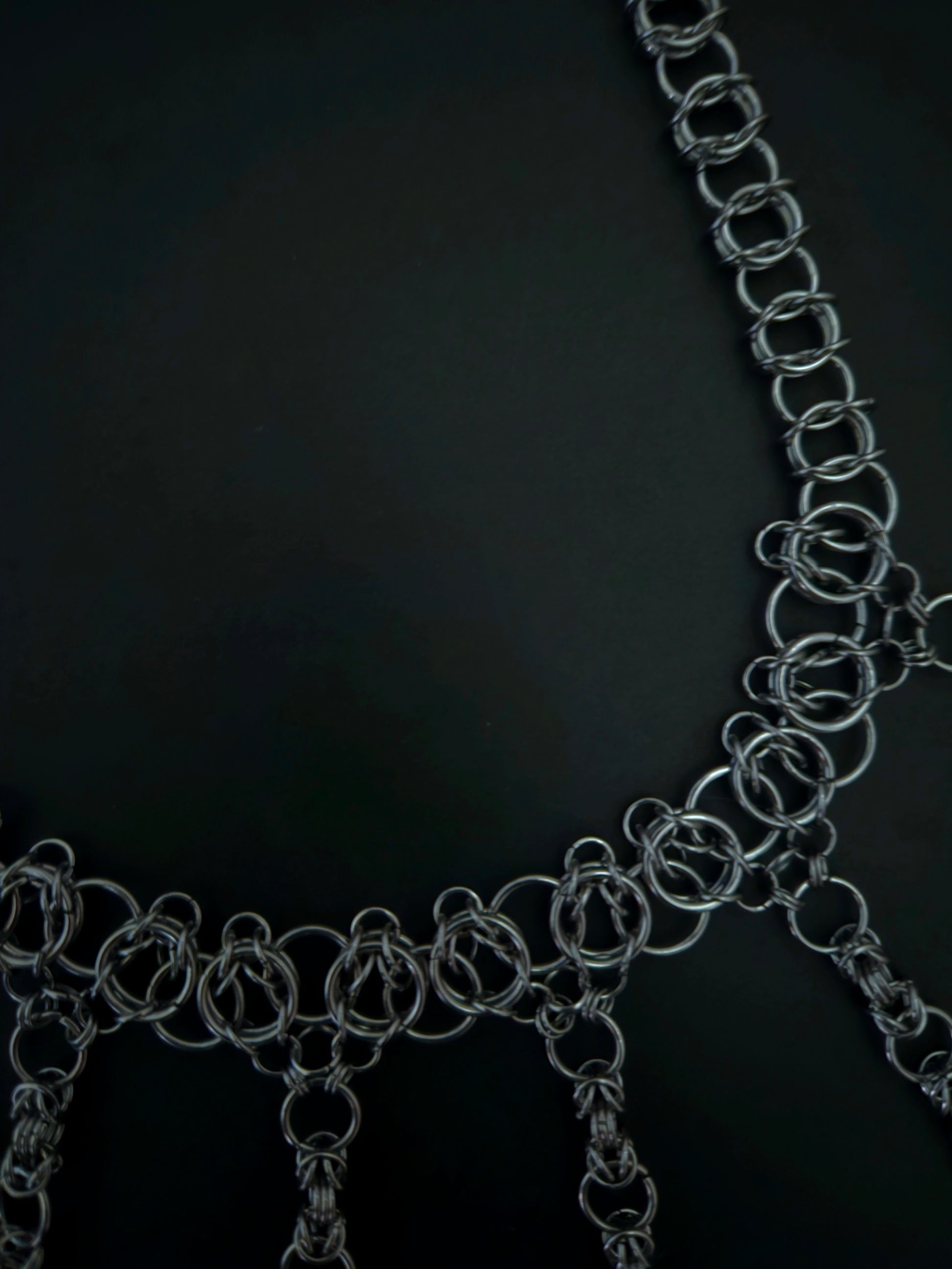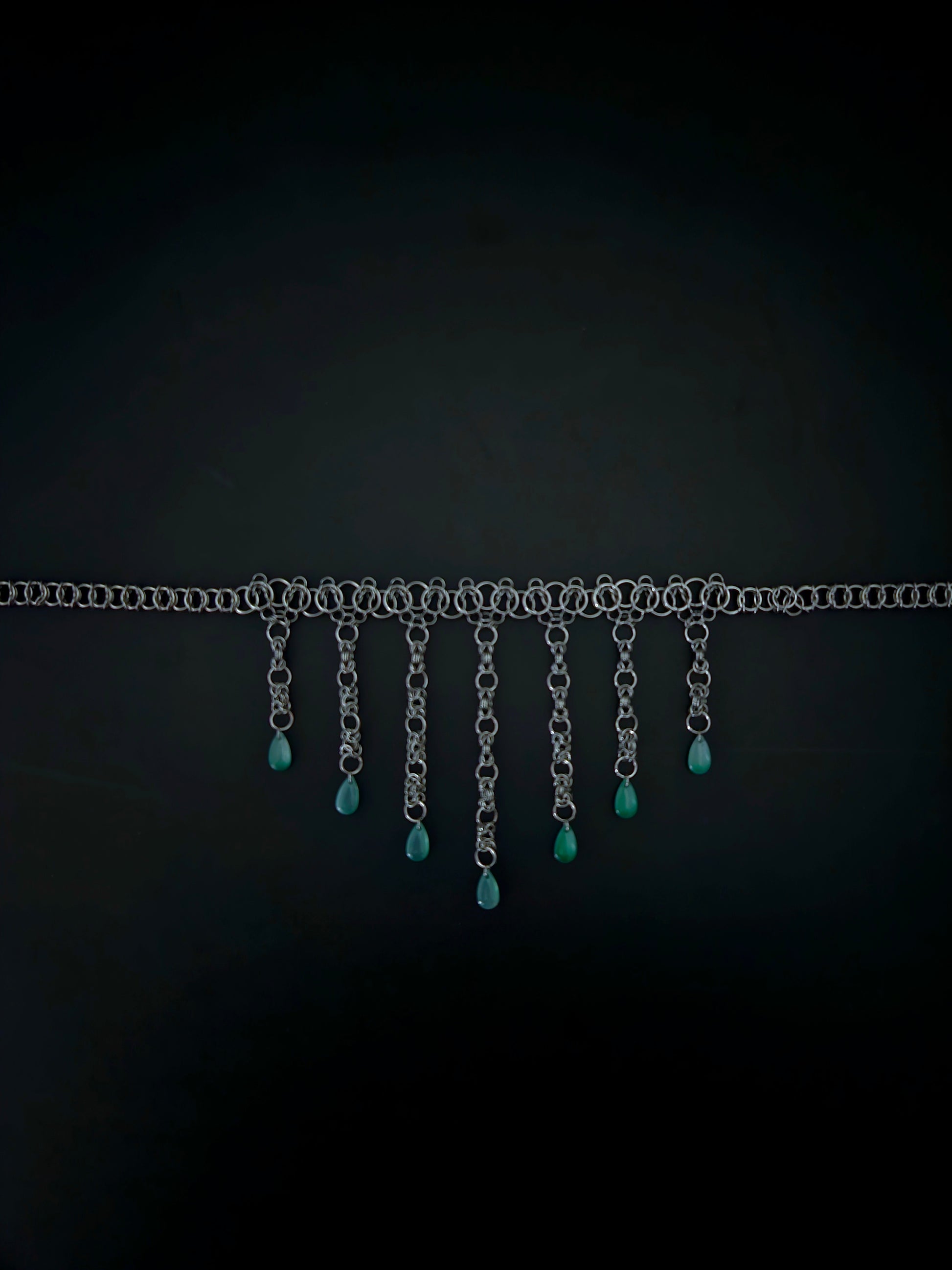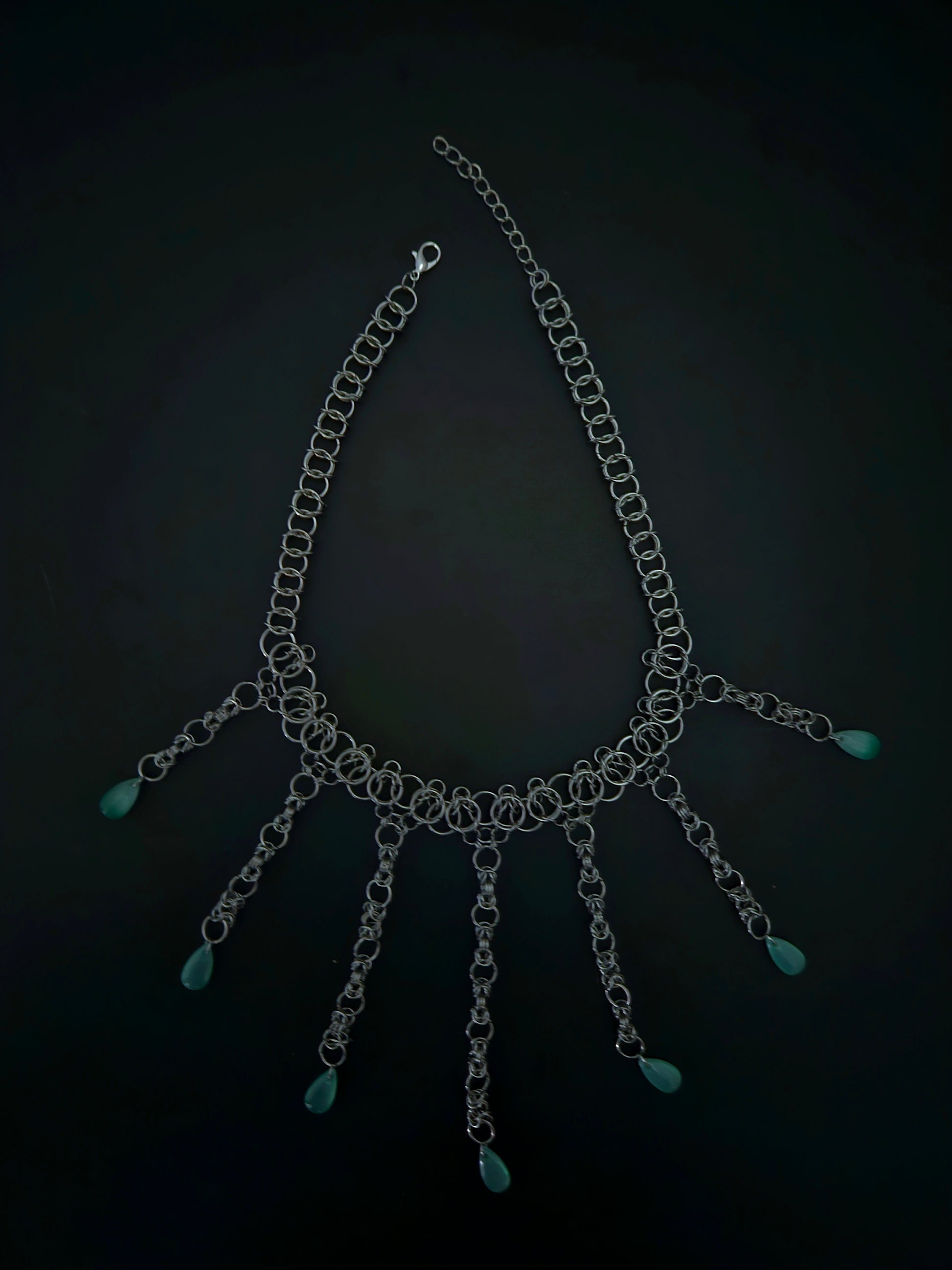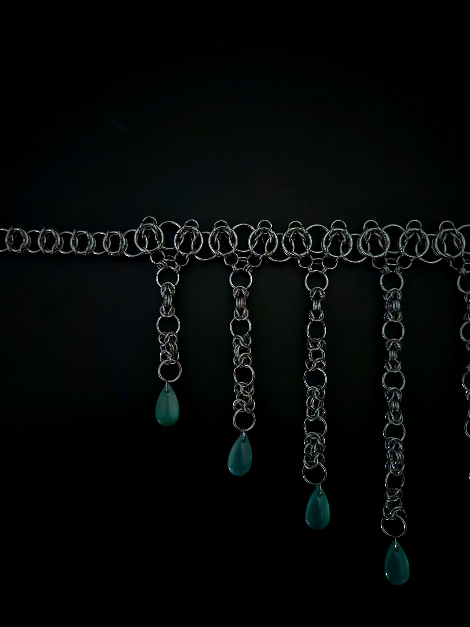 Modified Celtic vision weave in standard 14 inch choker length with claw clasp. 7 modified byzantine weaves hang down at various lengths with your choice tear drop bead hanging from each. Designed to wear against throat, 1.5 inch extender chain. Handmade from stainless steel rings.