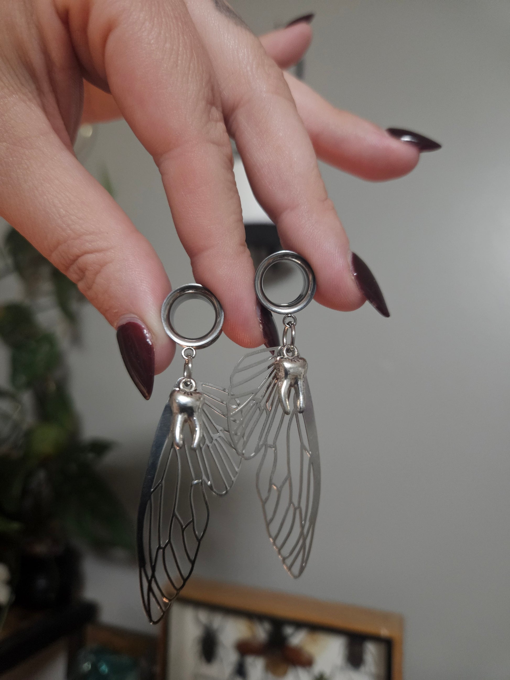 Pair of stainless steel double flared tunnels. Back flare is screw on. Alloy tooth and cicada wing charm.